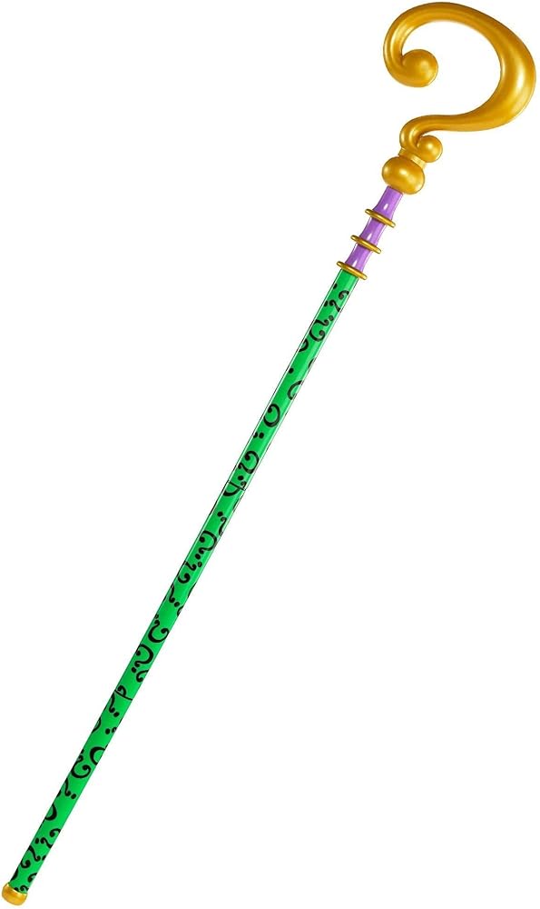 Riddle me this: I go everywhere you go, but you can't go anywhere without me. What am I? Answer: a cane! Drop clues as to who has the best Halloween costume with the Riddler Cane for adults. This plastic cane features a metallic gold handle shaped like the signature Riddler question mark and a black question mark pattern against a green background. Complete your look as the Prince of Puzzlers with this cane during Halloween, at cosplay events, themed parties, and more. Also makes a great gift for anyone who's nutty for Edward Nygma! Officially licensed Warner Bros. DC Comics product. Intended for adult use only.