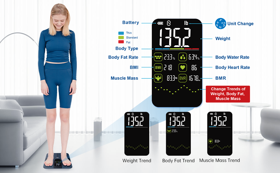 تتبع تقدمك بدون هاتف: يُظهر مقياس الوزن Lepulse مع دهون الجسم اتجاهات مفصلة للوزن ودهون الجسم وكتلة العضلات بالتناوب، مما يساعدك على الحصول على رؤية واضحة لتقدمك في لمحة حتى بدون هاتفك الذكي. في كل مرة يتقلب فيها وزنك للأسفل، كل نقطة تحول على منحنى التغيير هي بالنسبة لك شهادة على الانضباط الذاتي