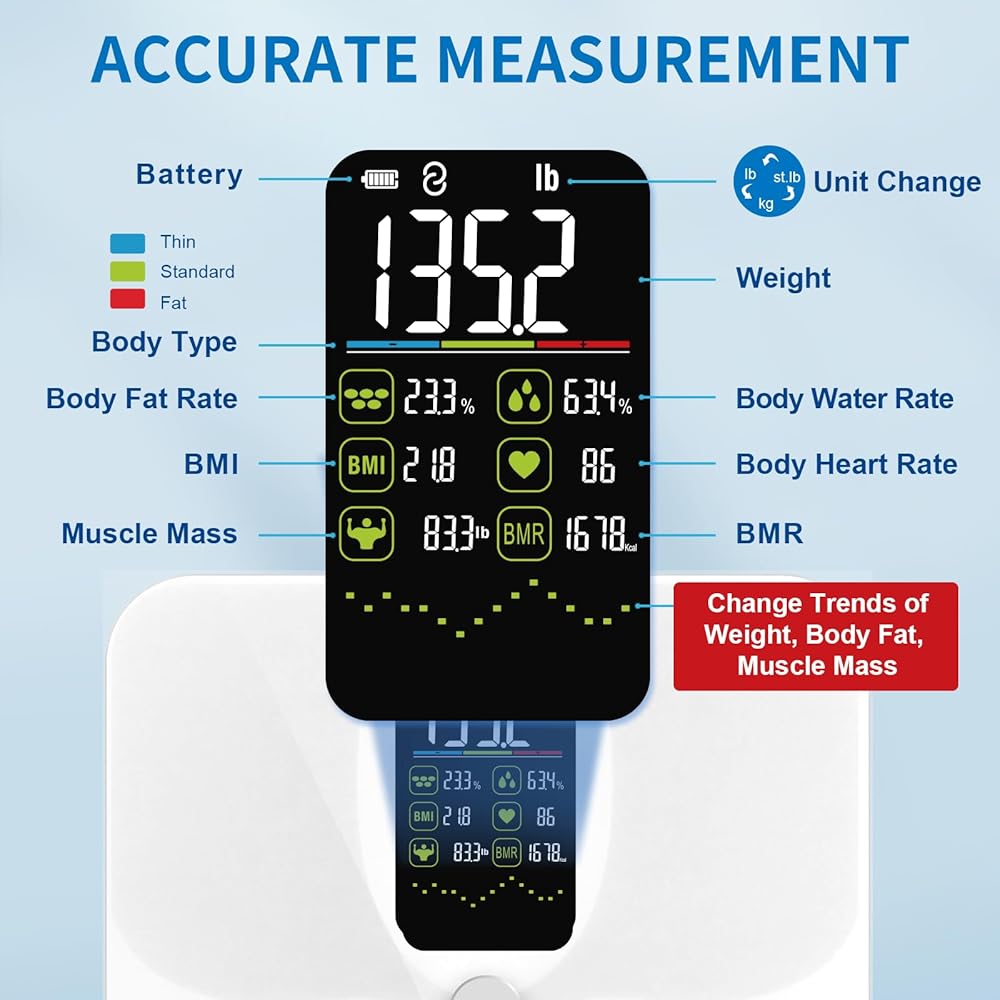 شاشة عرض كبيرة الكل في واحد: على عكس المقاييس الأخرى لوزن الجسم التي تعرض الوزن فقط، يمكن أن يُظهر مقياس دهون الجسم الخاص بنا 8 قياسات أساسية: الوزن، نسبة الدهون، وزن الماء، معدل ضربات القلب، مؤشر كتلة الجسم، كتلة العضلات، كتلة العظام والجسم. يكتب