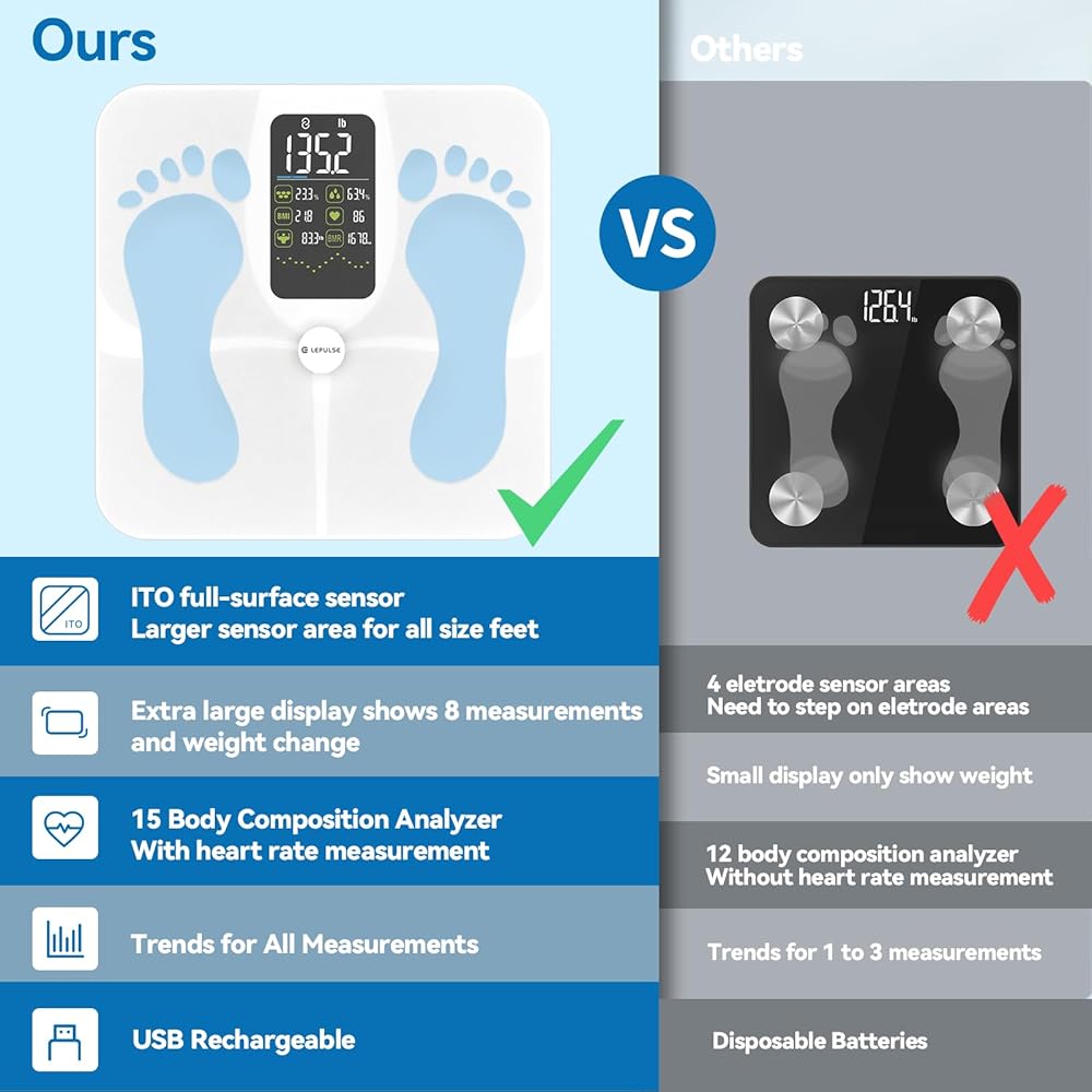 دقة عالية: يستخدم مقياس الدهون في الجسم الذكي Lepulse BIA المتقدم لقياس وتحليل تكوين جسمك. مزود بـ 4 أجهزة استشعار على شكل G، يمكن لميزان الحمام الذي يحتوي على مؤشر كتلة الجسم ودهون الجسم إجراء القياسات الأكثر دقة لتكوين جسمك. بالمقارنة مع موازين الحمام الأخرى للوزن مع 4 مناطق أقطاب كهربائية، يوفر مقياس وزن الجسم Lepulse مساحة استشعار أكبر بكثير لجميع أحجام الأقدام.