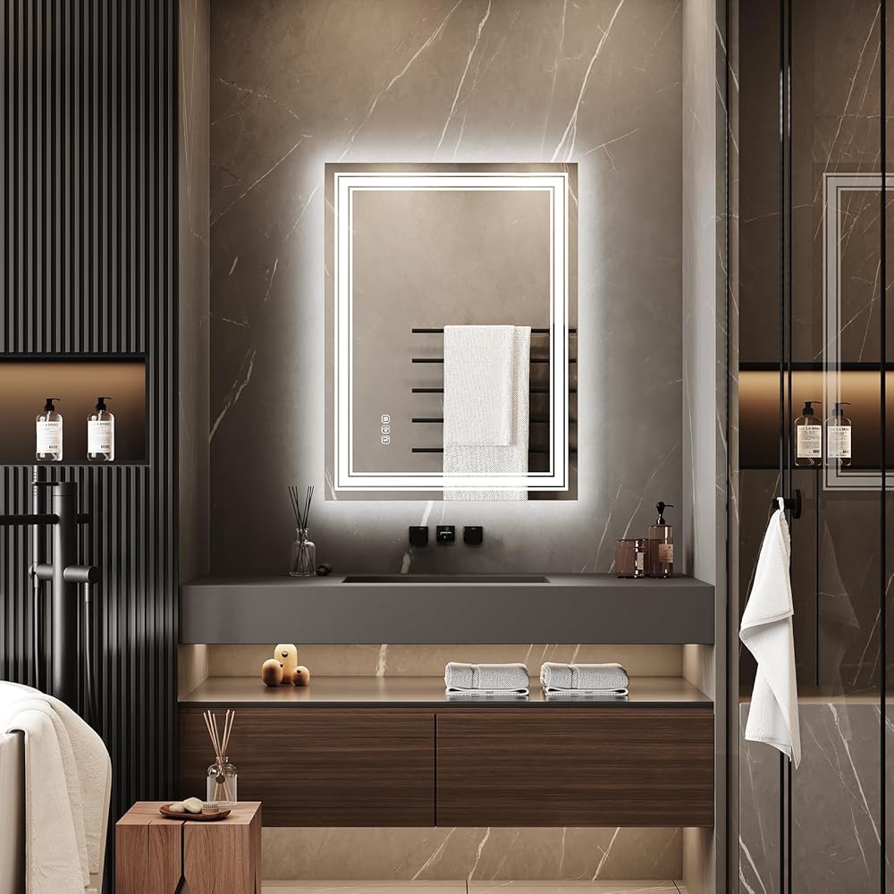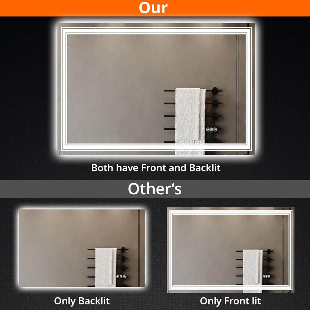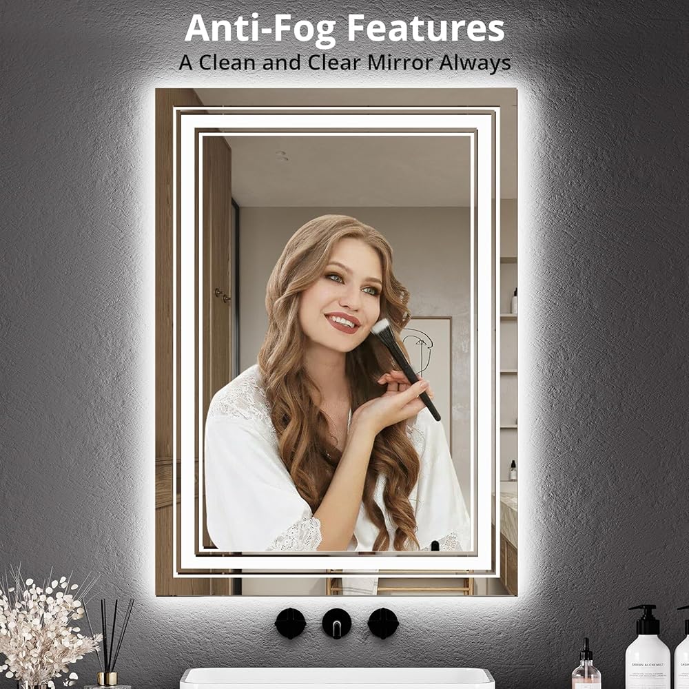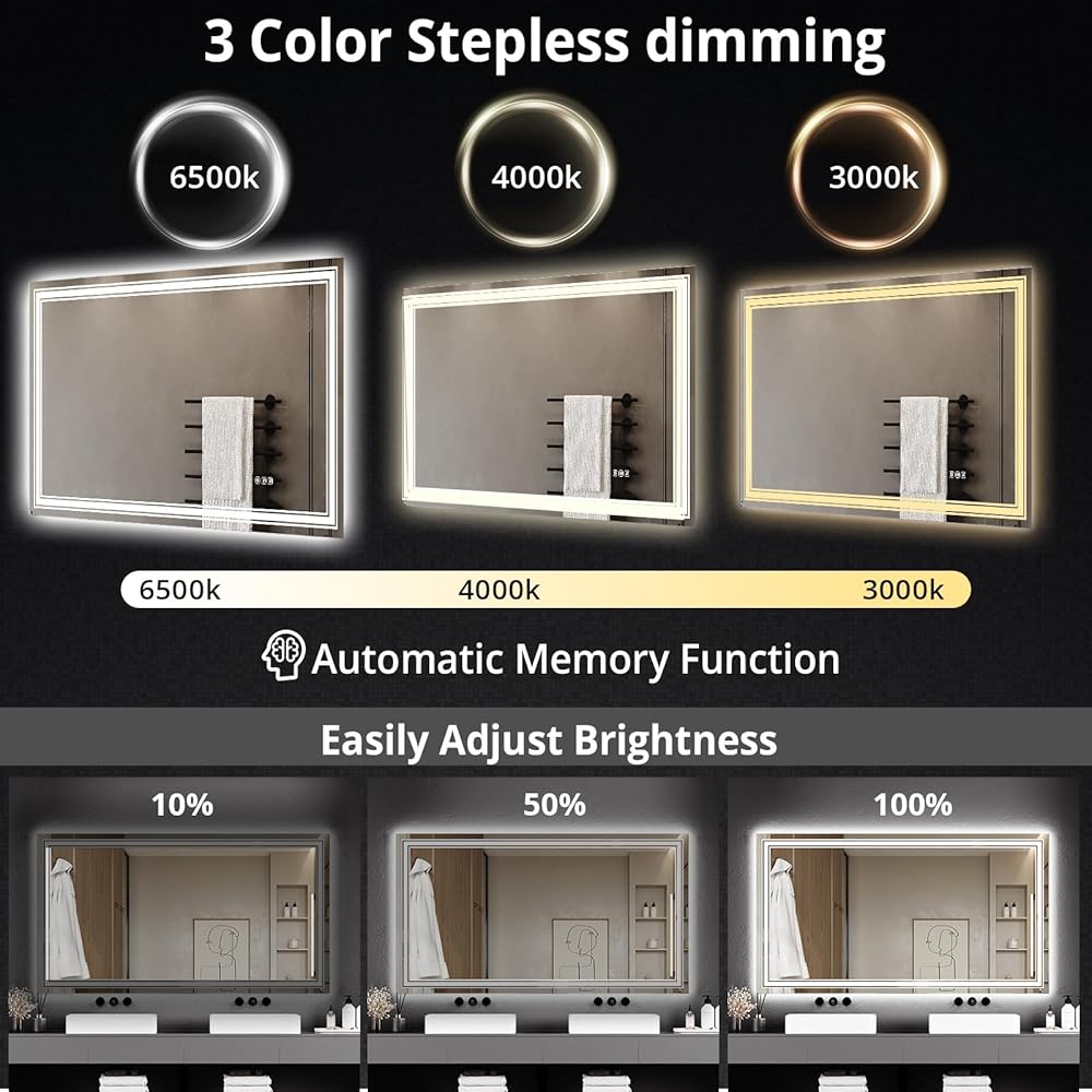 【سطوع قابل للتعديل و3 درجات حرارة ألوان】: استمتع بإضاءة قابلة للتخصيص مع ميزة السطوع القابلة للتعديل لهذه المرآة المضيئة للحمام. يمكنك ضبط السطوع بسهولة عن طريق الضغط مع الاستمرار على مفتاح اللمس. كل من الإضاءة الخلفية والأمامية قابلة للتعتيم، ويمكنك الاختيار من بين ثلاث درجات حرارة للألوان: الضوء الدافئ (3000 كلفن)، والضوء الطبيعي (4000 كلفن)، والضوء الأبيض (6500 كلفن). التصميم المقاوم للماء يجعل هذه المرآة مثالية لبيئات الحمام.