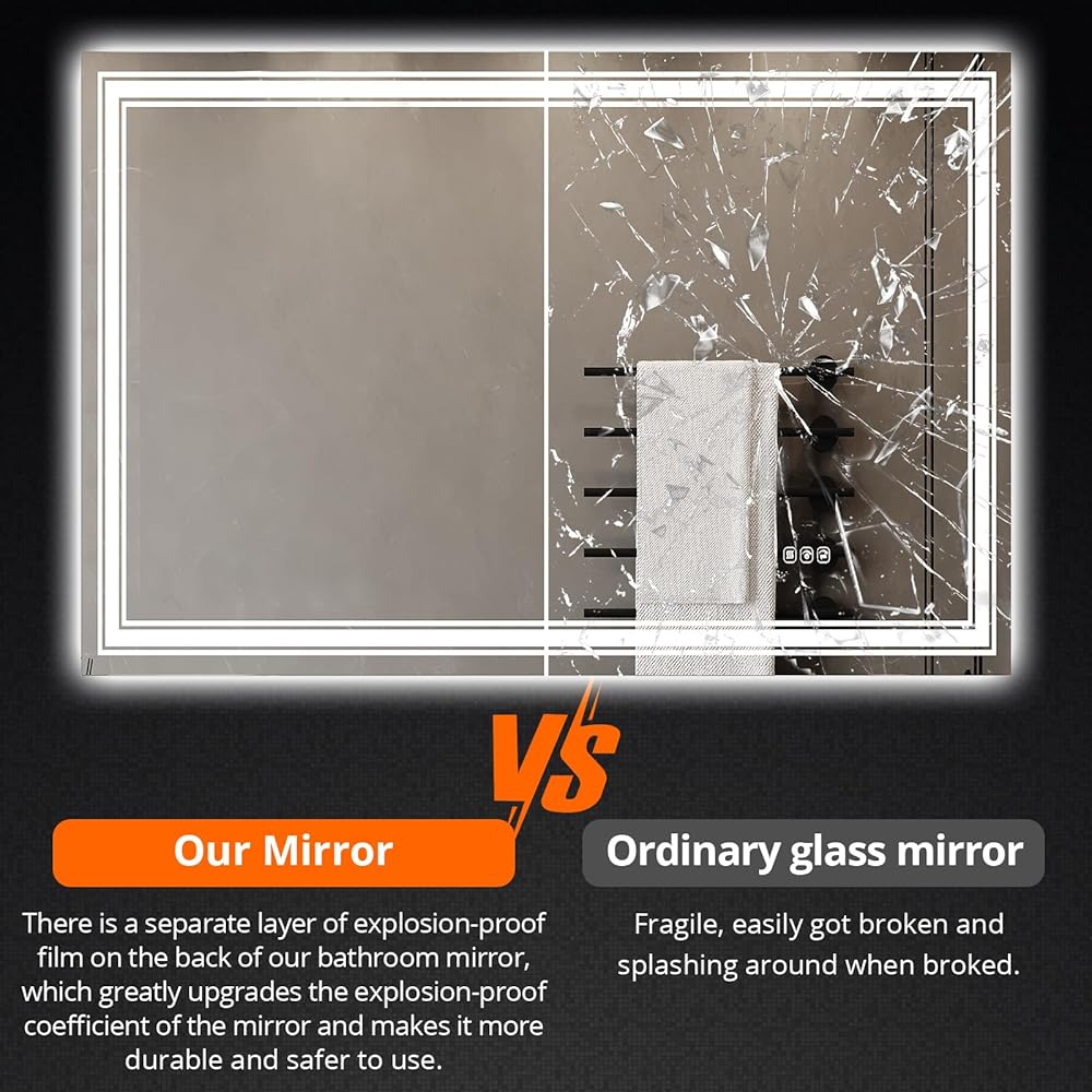 【فيلم مقاوم للانفجار، مقاوم للكسر، تصميم متين】: استمتع بالمتانة الفائقة لمرآة الحمام CuisinAid LED مع طبقة مقاومة للانفجار مرفقة على الظهر. يعزز هذا التصميم قوة المرآة، وخصائص مقاومة الكسر، وميزات مقاومة للانفجار. سلامتك هي الأولوية القصوى وتوفر هذه المرآة خيارًا آمنًا وموثوقًا لاحتياجات حمامك.