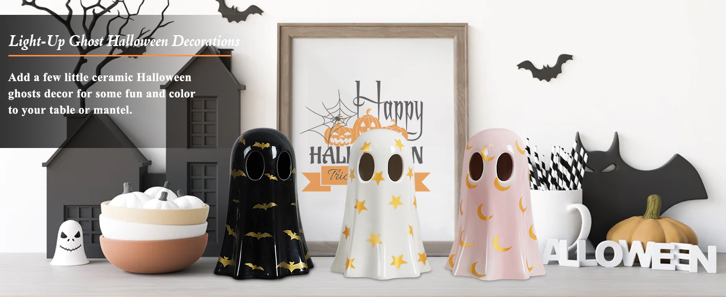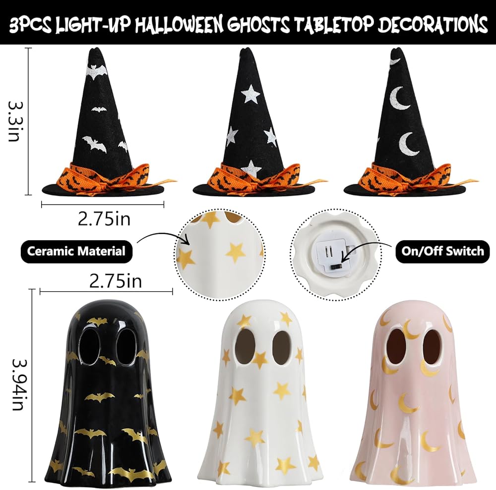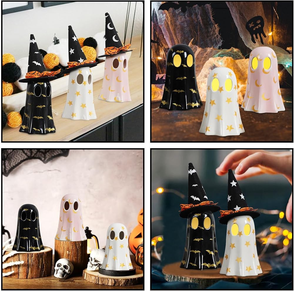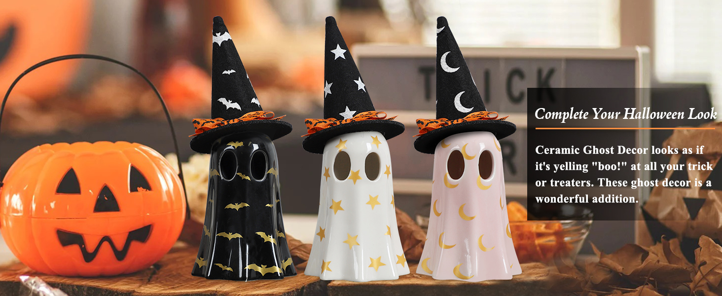 خامة فاخرة: مواد السيراميك تمنحها شعورًا أنيقًا، ولكنها ليست واهية على الإطلاق. قبعة من اللباد مع مزيج من شريط القوس من طراز الهالوين وبيت المزرعة. تتميز تماثيل شبح الهالوين هذه بأنها قوية ومقاومة للماء ومقاومة للبهتان.