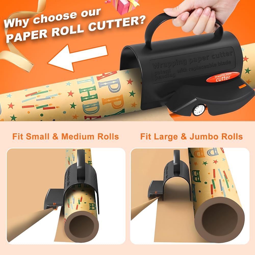 قاطع لفائف الورق قطعة واحدة أداة تقطيع لف الهدايا مع مقبض 3 شفرات قابلة للاستبدال لعيد الميلاد وعيد الشكر وعيد الميلاد وموزع تقطيع وتقطيع الشرائح باللون الأسود