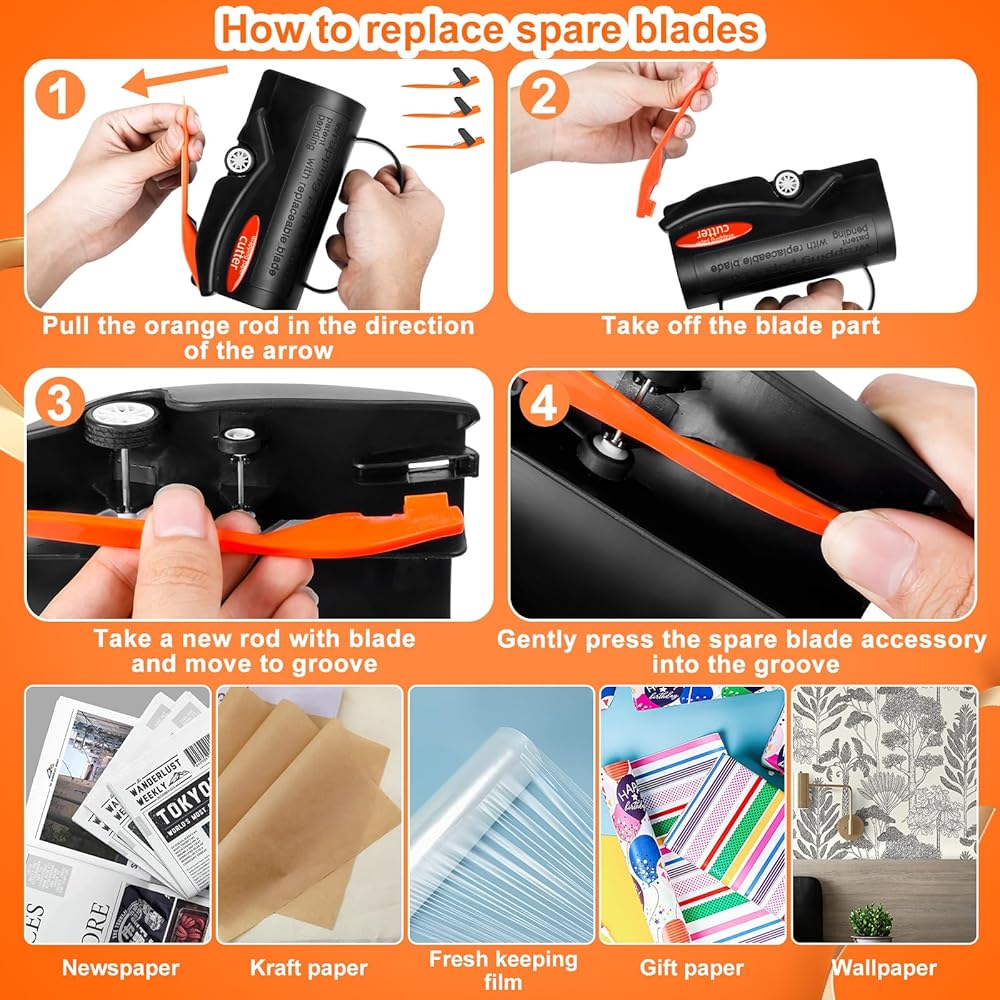 قاطعة شفرات قابلة للاستبدال: قاطعة ورق تغليف حاصلة على براءة اختراع مع 3 قطع من مجموعة الشفرات القابلة للاستبدال، مما يجعل من السهل استبدال الشفرات وتوفير أغطية حماية للشفرة. يمكن لكل مجموعة شفرات القطع أكثر من 2000 مرة، مما يجعل من السهل القطع عشرات الآلاف من المرات.