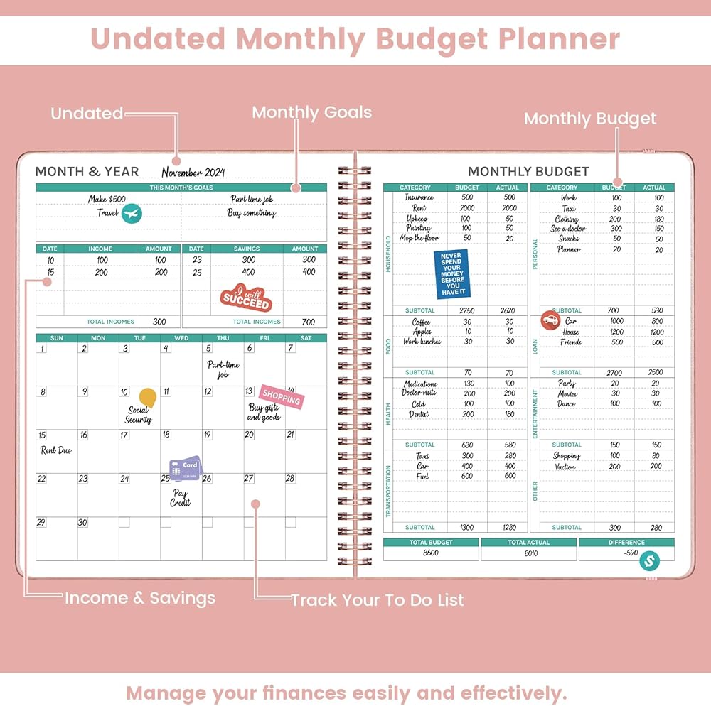 مخطط الميزانية غير محدث - مخطط الميزانية الشهري هذا غير مؤرخ ويغطي 12 شهرًا. صغير الحجم وحجم مثالي 20.32 سم × 25.4 سم، ويمكن وضعه بسهولة في أي حقيبة، مما يضمن وجود مخطط الميزانية بجانبك دائمًا وجاهز لتوجيه قراراتك المالية في أي وقت.