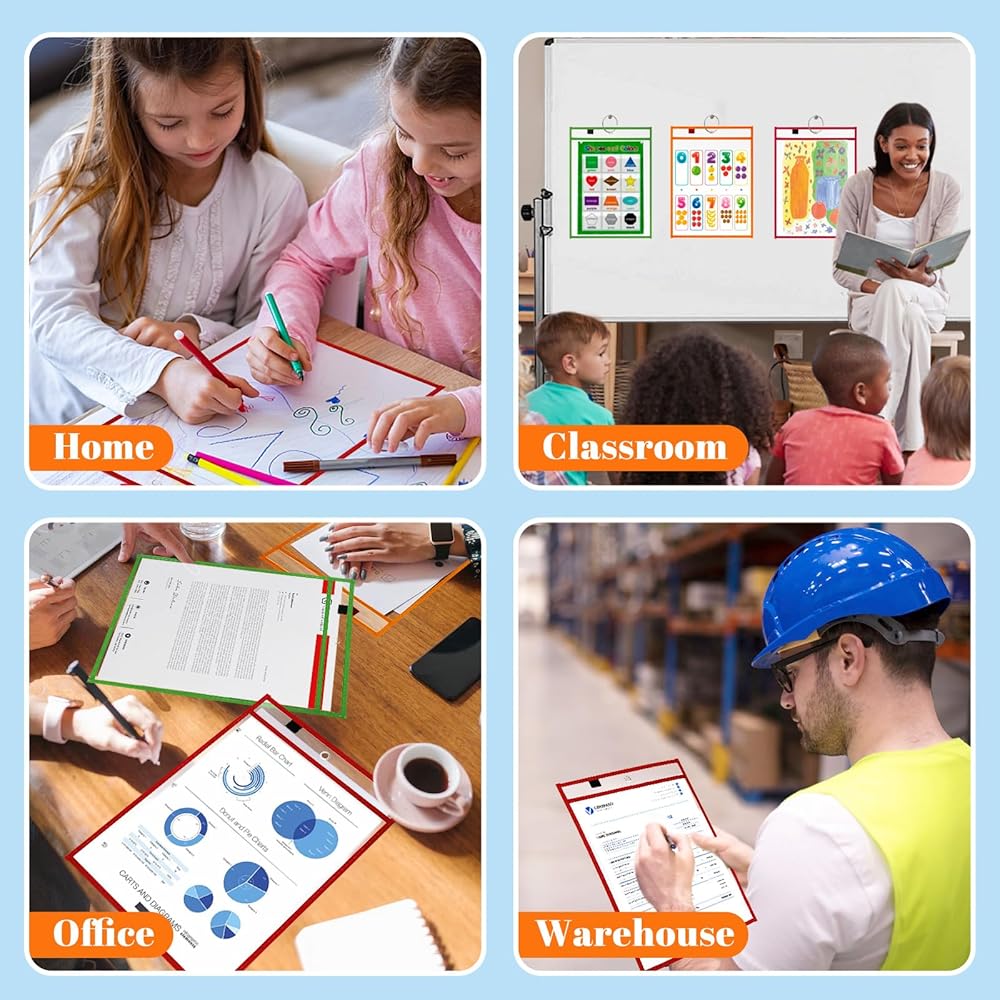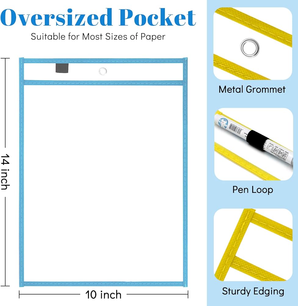 【مجموعة جيوب كبيرة الحجم للمسح الجاف】 6 عبوات من جيوب المسح الجاف كبيرة الحجم مع حلقتين. تصميم كبير الحجم (10 × 14 بوصة) مع 6 ألوان لإدراج وإزالة معظم الأوراق القياسية بشكل أنيق ويناسب معظم أنشطة الفصل الدراسي.