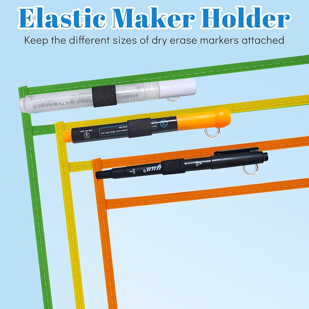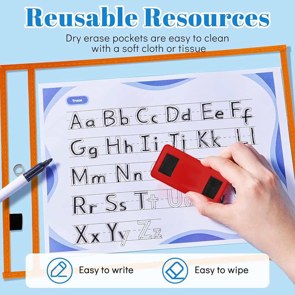【اللوازم المدرسية】 أوراق المسح الجافة القابلة لإعادة الاستخدام، جيوب حامل التذاكر تجعل من السهل تخزين مستنداتك القيمة ويمكنك تدوين الملاحظات عليها دون إتلاف الورق. مثالية للفصول الدراسية والمكاتب. يجب أن يكون لدى المعلم الفصول الدراسية.