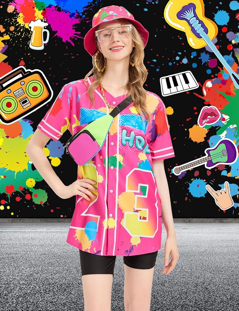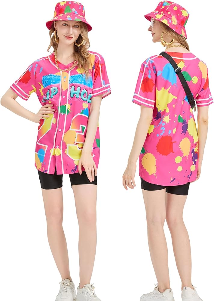 【كامل لملابس الحفلات التي تحمل طابع الثمانينيات والتسعينيات】يشتمل زي مغني الراب النسائي في التسعينيات على: 1X قميص جيرسي بيسبول، 1X سروال يوجا، 1X قبعة دلو، 1X سلسلة حبل ذهبية صناعية، 1X نظارات هيب هوب، 1X زوج من الأقراط الحلقية، 1X حزمة فاني. إكسسوارات كاملة لتلبية احتياجاتك المتنوعة من الملابس لموضوعات الحفلات في الثمانينيات والتسعينيات وتتيح لك التميز بين الآخرين.