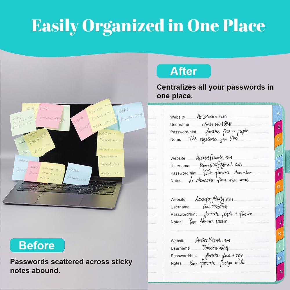 [إدارة سهلة لكلمات المرور] هل سئمت البحث عن كلمة المرور الخاصة بك أو إعادة تعيينها باستمرار؟ يساعدك كتاب حفظ كلمات المرور المصمم خصيصًا لدينا على تسجيل جميع كلمات المرور الخاصة بك وتخزينها بسهولة في مكان واحد آمن، مما يوفر عليك متاعب إدارة كلمات المرور المتعددة