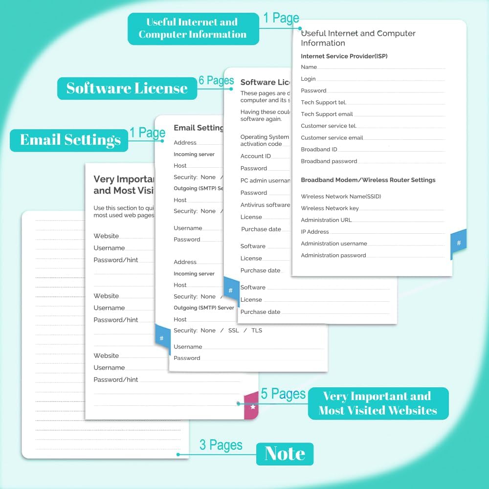 [مساحة واسعة للإدخالات] يضم 115 ورقة من الورق السميك 100 جرامًا للمتر المربع، يوفر سجل كلمات مرور الإنترنت هذا مساحة واسعة لما يصل إلى 851 كلمة مرور، وهو ضعف سعة تخزين الخيارات النموذجية المتاحة في السوق. بالإضافة إلى ذلك، فهو يوفر مساحة إضافية لمقدمي خدمات الإنترنت وإعدادات جهاز التوجيه اللاسلكي وتراخيص البرامج والمزيد