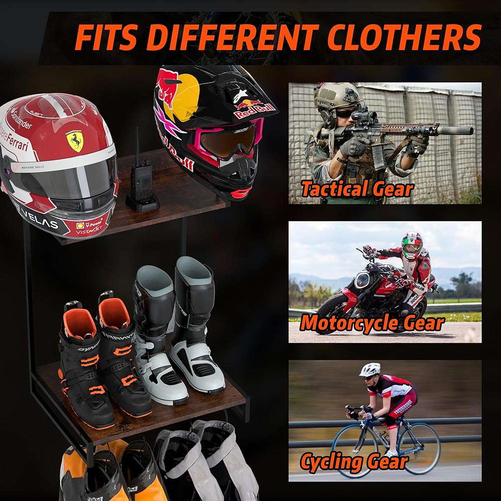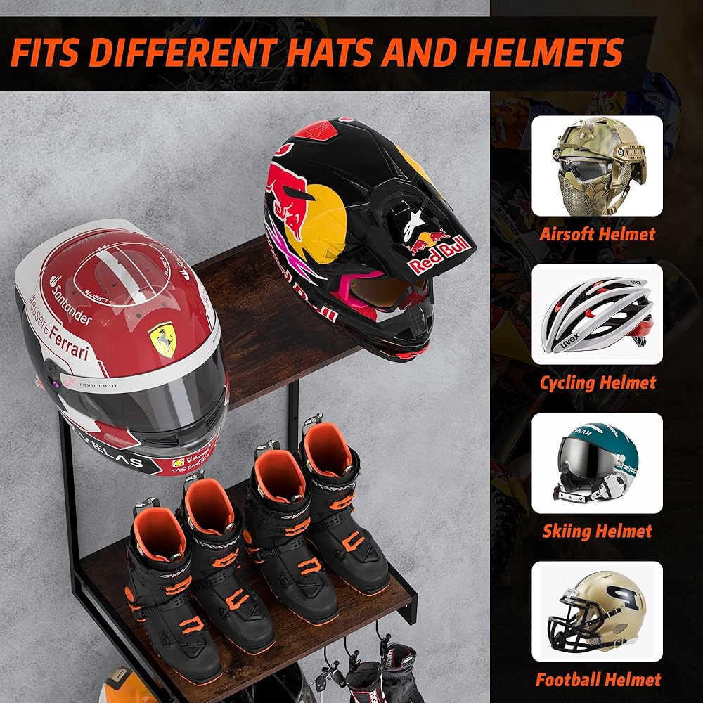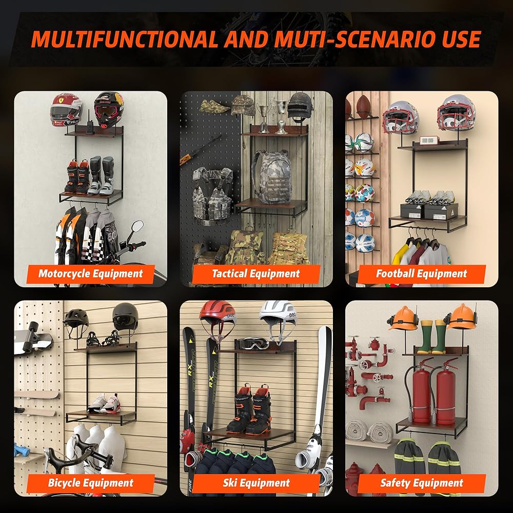 【وضع أنيق وتوفير المساحة】يسمح لك بتخزين تروسك بسهولة والحفاظ عليها أنيقة وجميلة. لا يستوعب حامل الخوذة الجداري هذا خوذات الدراجات النارية فحسب، بل يستوعب أيضًا خوذات البيسبول وكرة القدم بالإضافة إلى أنواع مختلفة من القبعات. كما أنها مناسبة لتنظيم المعدات التكتيكية والسترات والقفازات ومعدات التزلج والمزيد. مثالية لعشاق التكتيكية وأي شخص يحتاج إلى تخزين معدات متعددة الوظائف.
