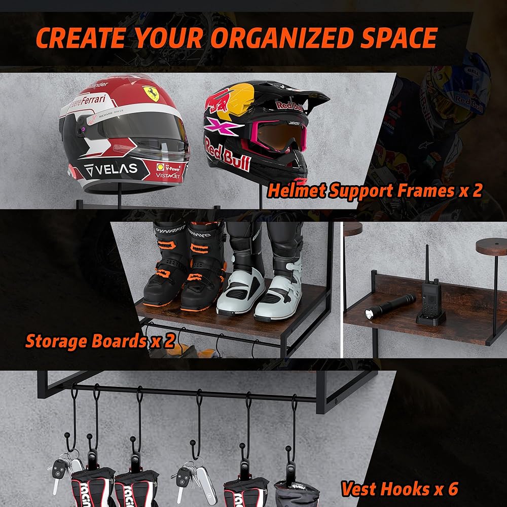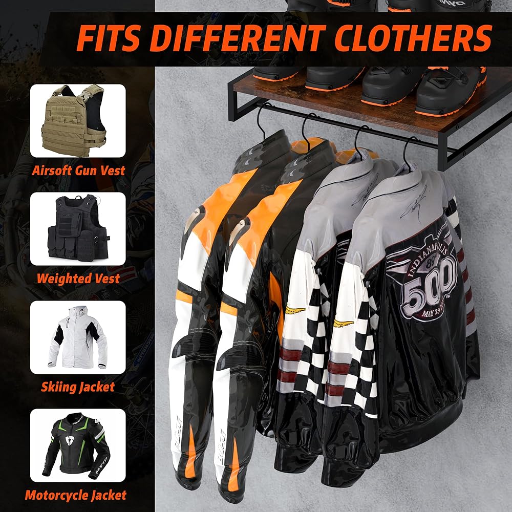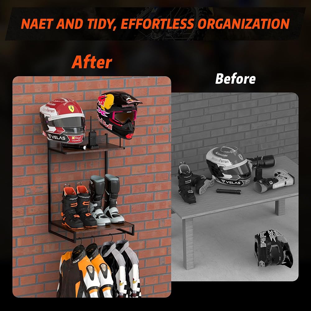 【تخزين رأسي فعال】يتميز حامل خوذة الدراجة النارية Guulibera على الحائط بتصميم مثبت على الحائط ونظام تخزين مفتوح يضمن المتانة والجمال الكلاسيكي، مما يعزز مظهر أي مساحة.