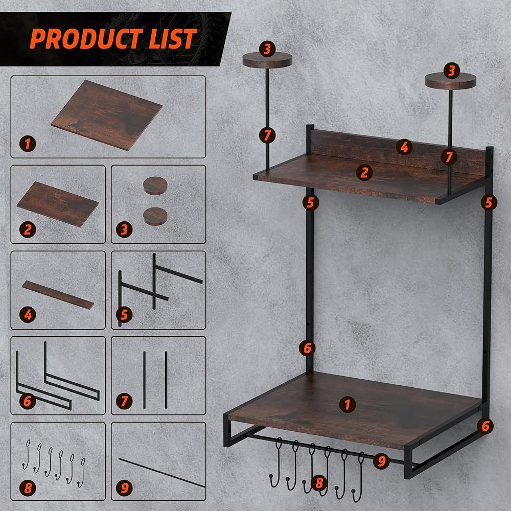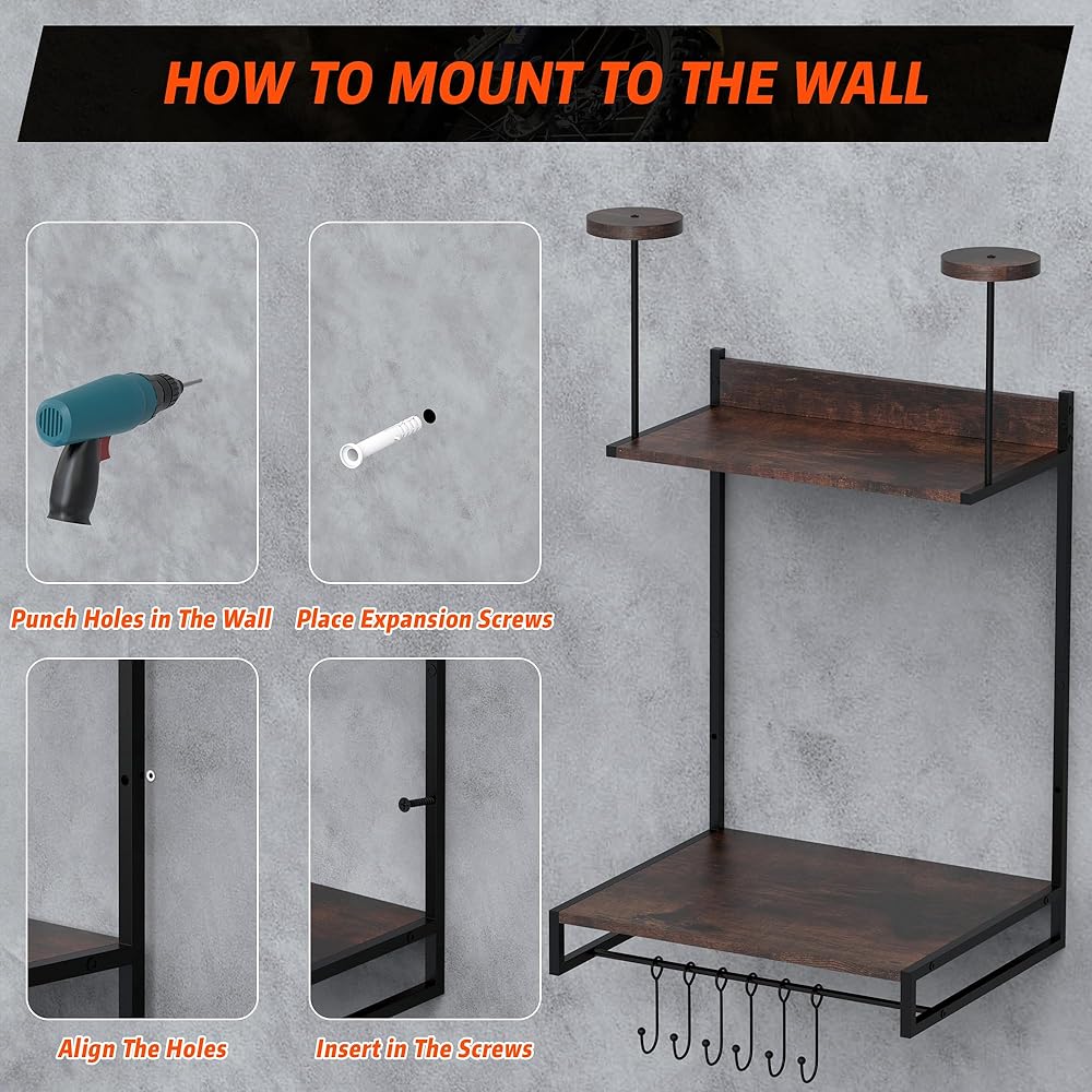 【سهلة التركيب】يأتي حامل الخوذة الخاص بنا مع تعليمات تركيب مفصلة، مما يضمن أنه يمكنك إكمال الإعداد بسهولة في فترة زمنية قصيرة. لا حاجة لأي شيء سوى بعض البراغي لتثبيت أرففنا العائمة على الحائط في دقائق قليلة. حامل خوذة الدراجة النارية سهل التركيب ويمكن تركيبه على أنواع مختلفة من الجدران، مما يسمح لك بتخصيص موضعه وفقًا لتفضيلاتك.