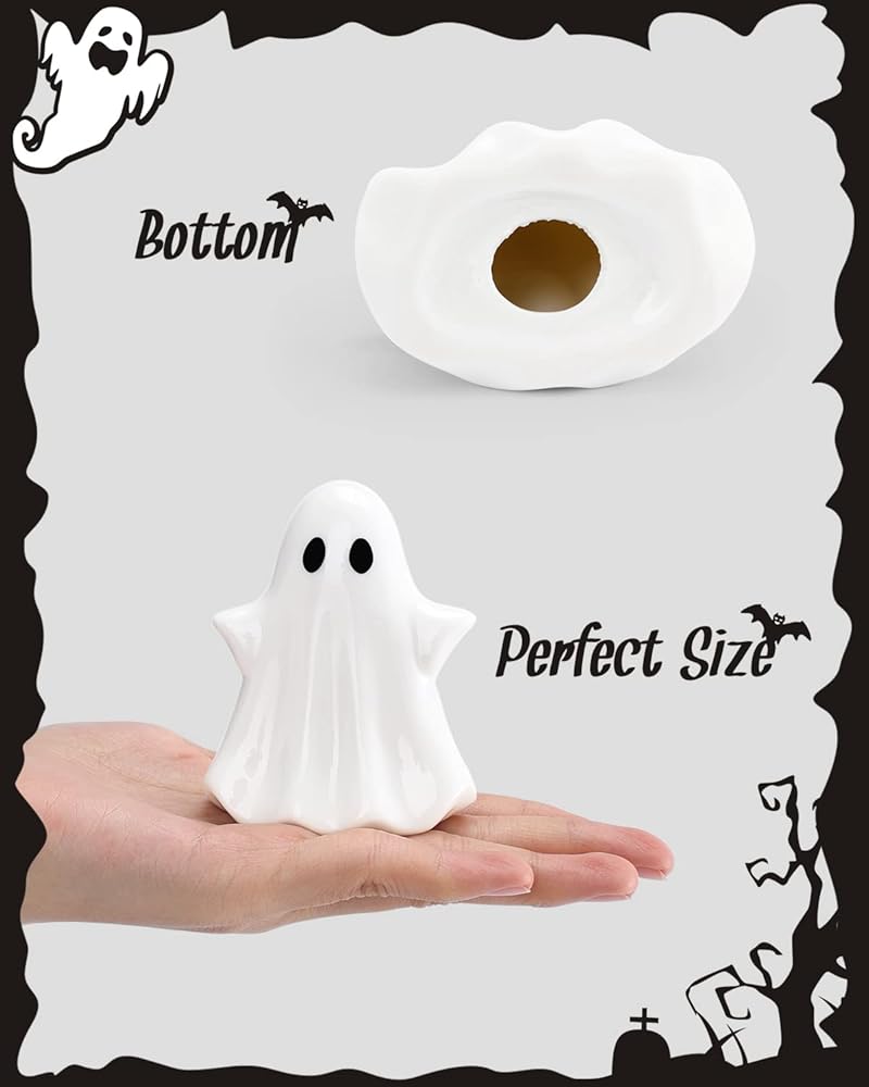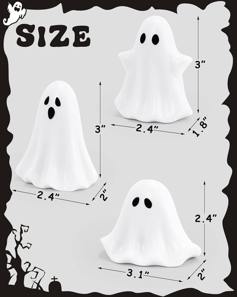 حجم صغير -- مجموعة الأشباح الخزفية تأتي بأحجام مختلفة من الأشباح الصغيرة ذات الوجوه التعبيرية، بطول 6.35 سم إلى 7.62 سم. كل تمثال شبح مجوف ويوضع بثبات على أي سطح دون أن ينقلب، مما يسمح لك بوضع شمعة صغيرة LED (غير متضمنة) في الأسفل.