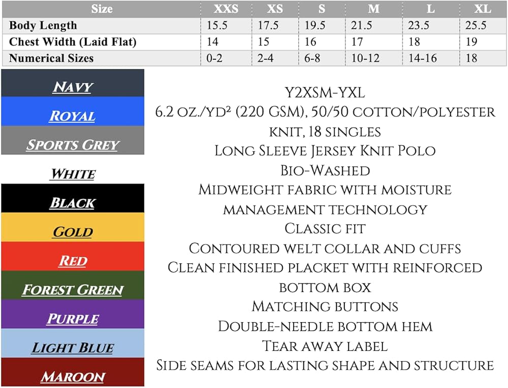 Versatile and Durable: Available in a wide range of sizes and colors, these polos are built to withstand everyday wear and tear, maintaining their quality and look over time. The durable fabric resists fading and shrinking, even after multiple washes, ensuring that the shirts retain their vibrant colors and perfect fit. These long sleeve polo shirts are a reliable addition to your child's wardrobe, offering style, comfort, and longevity.