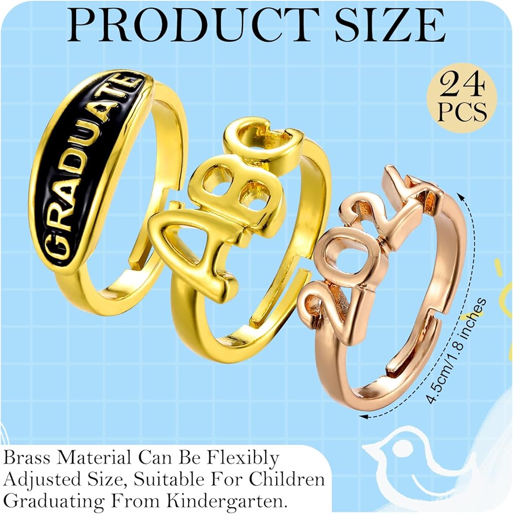 • 3 Styles: our kindergarten class rings 2024 come in 3 distinct styles, printed with the words [graduate], [ABC], and [2024], each echoing the diverse strengths and traits of our small yet mighty graduates, which makes each ring uniquely special