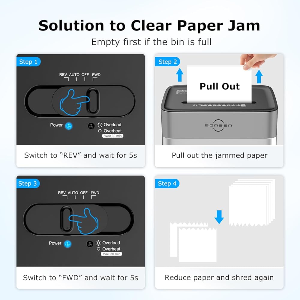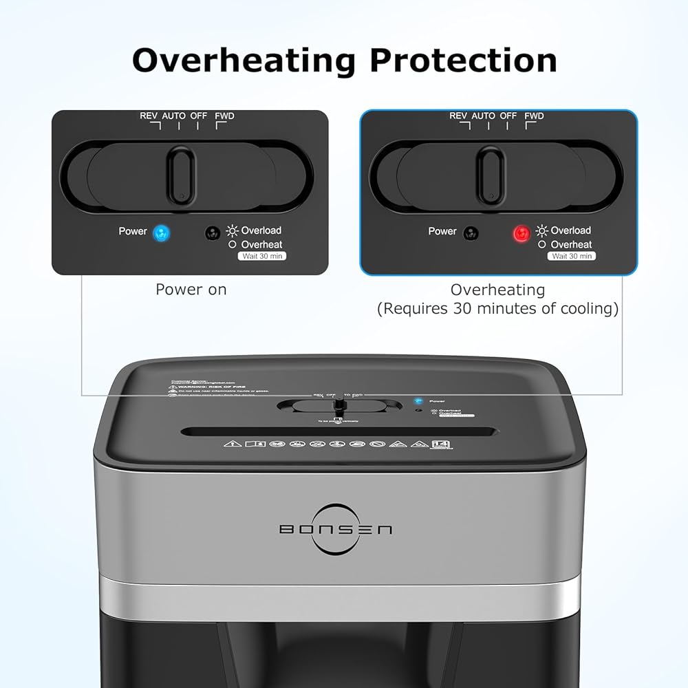 • سهل الاستخدام ونظام مضاد للانحشار: تم تجهيز آلات تمزيق BONSEN للاستخدام المكتبي بمفتاح تحكم بأربعة أوضاع (الأمام، التلقائي، الإيقاف، العكسي) ومؤشرات إضاءة LED (التشغيل، الحرارة الزائدة، التحميل الزائد)؛ الحماية من الحرارة الزائدة (الضوء الأحمر قيد التشغيل) والحماية من التحميل الزائد (وميض الضوء الأحمر) تجعل الاستخدام أكثر أمانًا