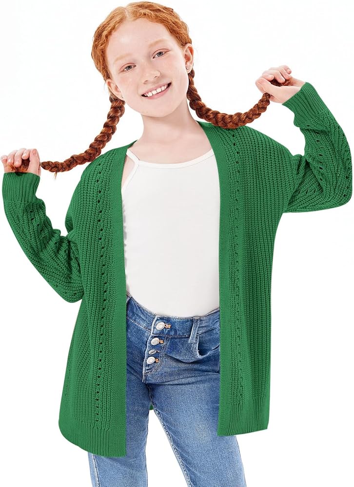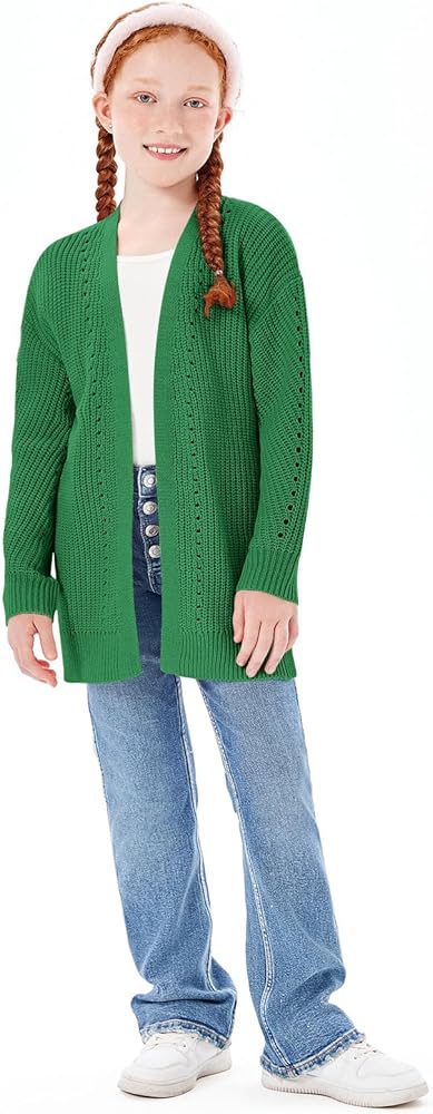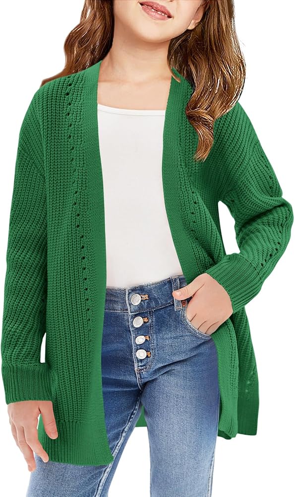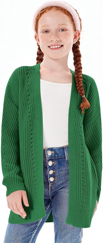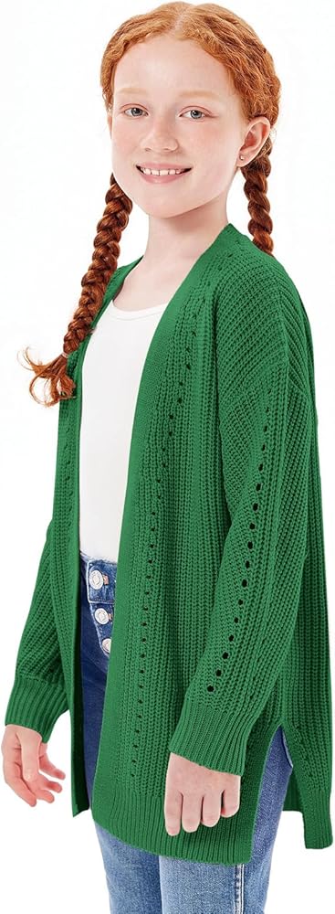 تصميم فريد: سترة صوفية للفتيات بأكمام طويلة، مفتوحة من الأمام، طراز فضفاض كبير الحجم، لون ثابت، نسيج محبوك مكتنز، سترة صوفية خاصة مع قليل من التجويف، تصميم حاشية مقسمة، طول أسفل الورك، سترة طويلة كاجوال معاطف شتوية للفتيات، خط حاشية وأساور مضلعة مستقيمة