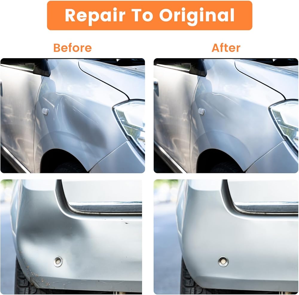 【سهلة التشغيل】أولاً، نظف السطح واترك مجموعة إصلاح الانبعاجات بدون طلاء تجف. بعد ذلك، قم بتسخين منطقة الانبعاج واضبط مقبض مزيل انبعاجات السيارة على الوضع المنفصل. بعد ذلك، ضع مزيل الانبعاجات بكوب الشفط على السطح وادفعه للأسفل في الهواء. أخيرًا، اسحب المقبض المزدوج بسرعة إلى الوضع العلوي، ويمكنك سحب المقبض بقوة.