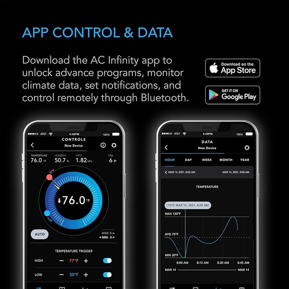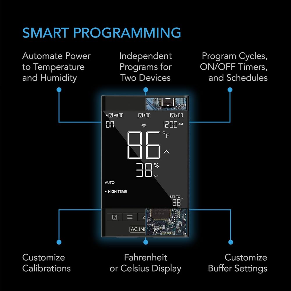 Features programmable triggers that power two outlet devices to turn on or off in response to temperature and humidity levels. Adjust buffer settings to customize how they react to climate changes. Timer, on/off cycle, and schedule modes add custom on-demand activation for a variety of uses. Backup memory retains settings even if the controller is cut from power. Securely connect with the AC Infinity app via Bluetooth to access your outlet controller remotely, unlock advance programs, set notifications, view historical climate charts, and export CSV data.