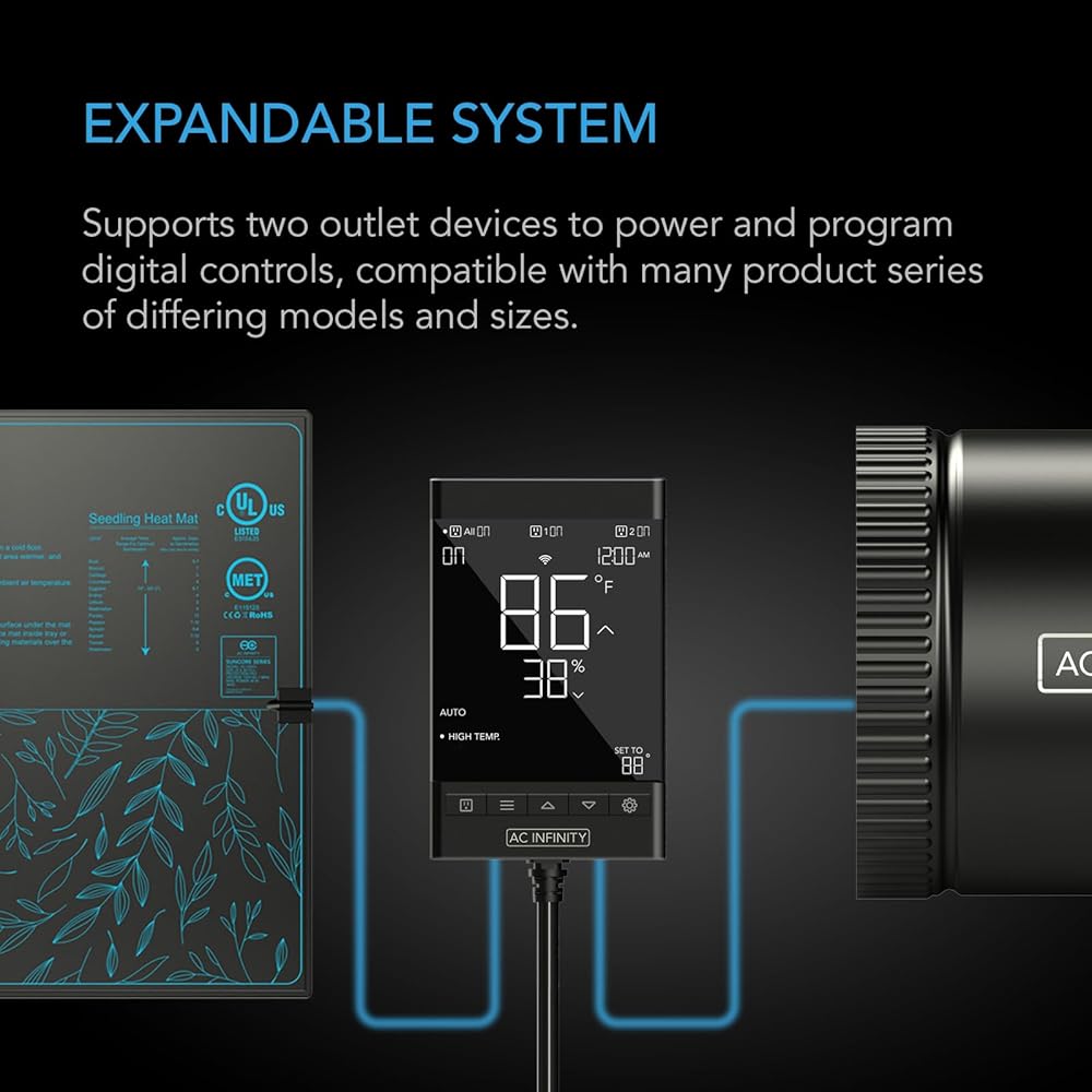 This smart outlet controller is equipped with two outlet sockets to power and distribute unique programming to two devices, supporting up to 1100W. Plug in devices with AC power plugs such as inline duct fans, shutter exhaust fans, or clip-on oscillating fans to automate cooling and airflow production. Other compatible devices include seedling heat mats to activate heating for homebrewing and fermenting beverages, warming terrariums, or starting, germinating, and propagating seeds.