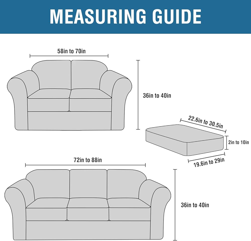 خيارات المقاس: تم تصميم أغطية المقعد المنزلقة بنمط 3 قطع (بما في ذلك غطاء قاعدة واحد وغطائي وسادة فرديين). يناسب الأرائك التي يتراوح عرضها من 58 إلى 70 بوصة، وطولها من 36 إلى 40 بوصة. تم تصميم أغطية الأريكة الانزلاقية بنمط 4 قطع (بما في ذلك غطاء قاعدة واحد و3 أغطية وسائد فردية)، تناسب الأرائك التي يتراوح عرضها من 72 إلى 88 بوصة، وطولها من 96 إلى 40 بوصة. كل غطاء وسادة فردي يناسب ما يصل إلى 19.6 إلى 29.5 بوصة طولًا، 21.6 إلى 30.5 بوصة عرضًا، 2 إلى 10 بوصات ارتفاعًا.