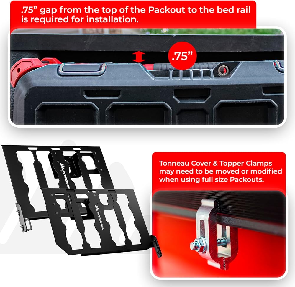 • Fitment - Tonneau Cover and Toppers: Tonneau covers and toppers do affect the fitment with some Packout boxes depending on the clamp locations. Most clamps will need to be moved away from the plate. Not compatible with tonneau cover rails that hang lower than the bedside. The plate will only work with the rear Boxlink mount. Does not work with plastic bed inserts without trimming. Spray-in bed liners are okay. The boxlink holes will need to be threaded if not already done. Thread forming hardware and instructions included.