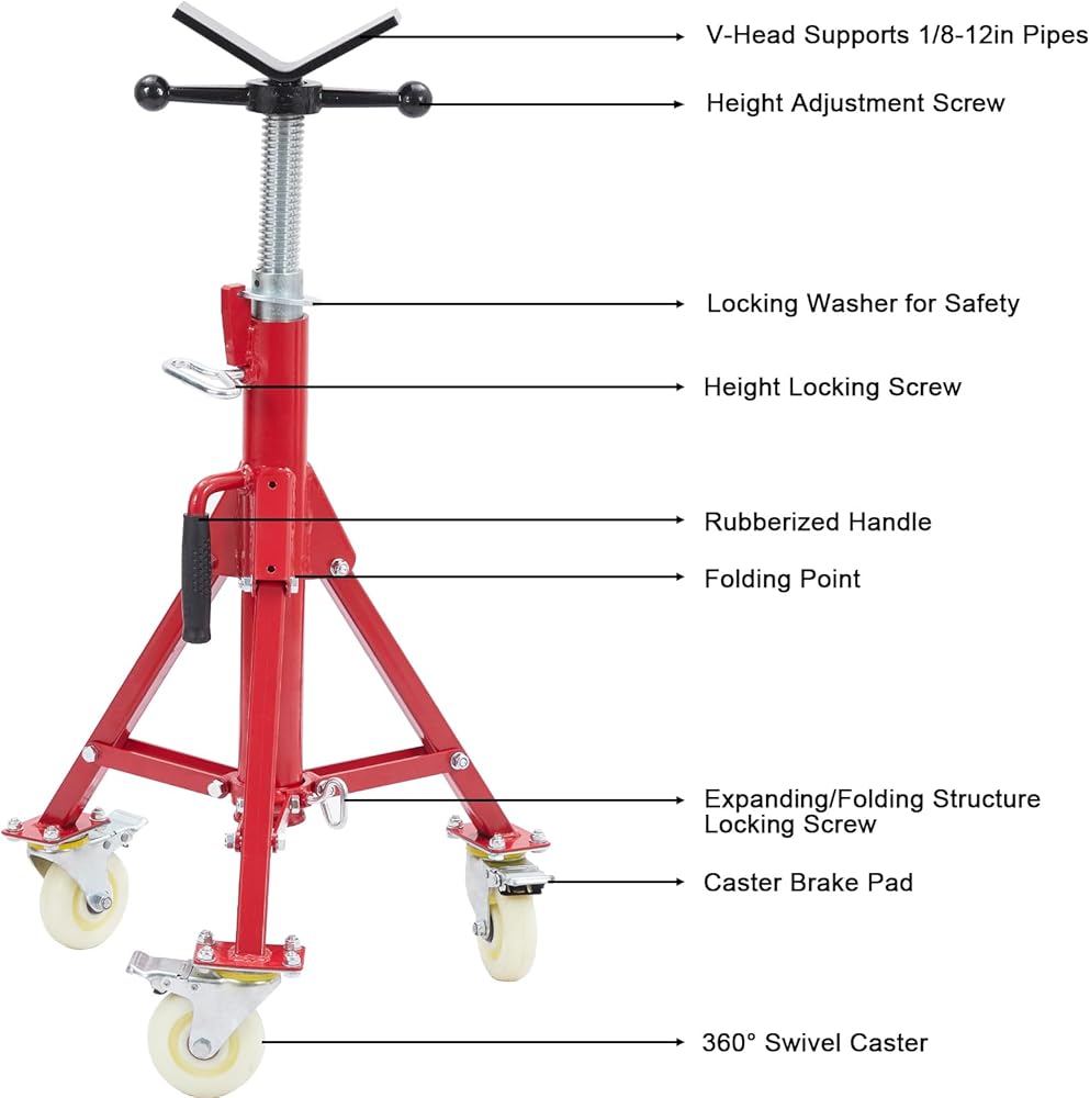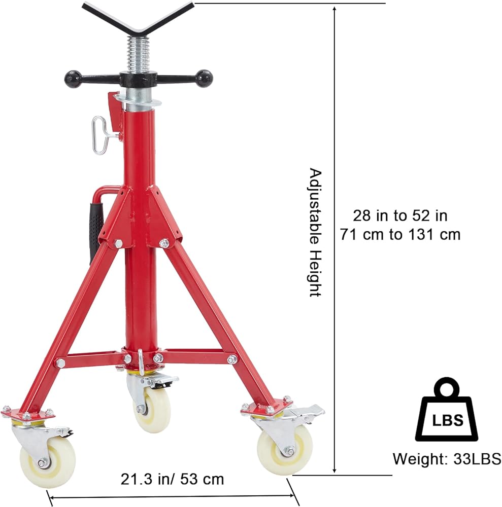حامل أنابيب على شكل حرف V مع عجلات، حامل جاك قابل للطي على شكل حرف V، حامل لحام 2500 رطل ارتفاع قابل للتعديل 28-52 بوصة، هيكل من الصلب الكربوني شديد التحمل، مقابس أنابيب فولاذية للحام