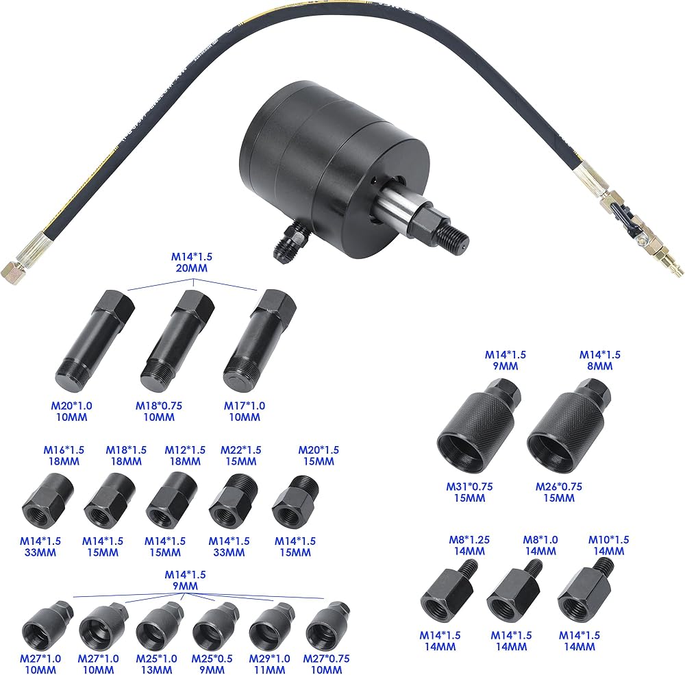 محولات مختلفة: تتضمن المجموعة الرئيسية لمستخرج حاقن الديزل M20×1.0، M18×0.75، M17×1.0، M8×1.25، M8×1.0، M14×1.5، M12×0.5، M10×1.5، M25×1.0، M27x0.75، M27x1.0، M29x10. توفر مجموعة أدوات سحب حاقن الديزل الهوائية دعمًا واسع النطاق، يغطي مجموعة واسعة من أنظمة الحقن لتلبية احتياجات نماذج المحرك المختلفة