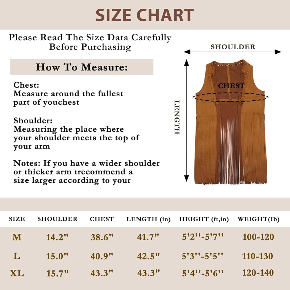 Hippie vest available in 2 sizes: Size L fits busts up to 40.2”/102 cm, with a garment length of 17.3” and a total length of 40.2”; Size XL accommodates busts up to 42.5”, with a garment length of 18.9” and a total length of 42.1”.