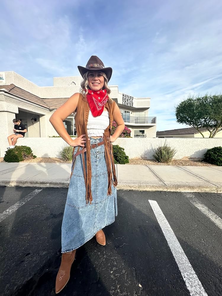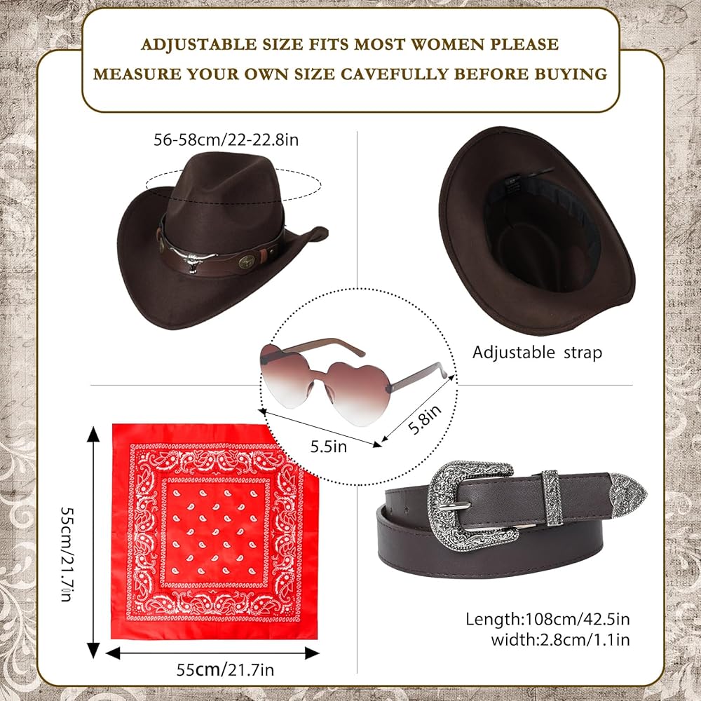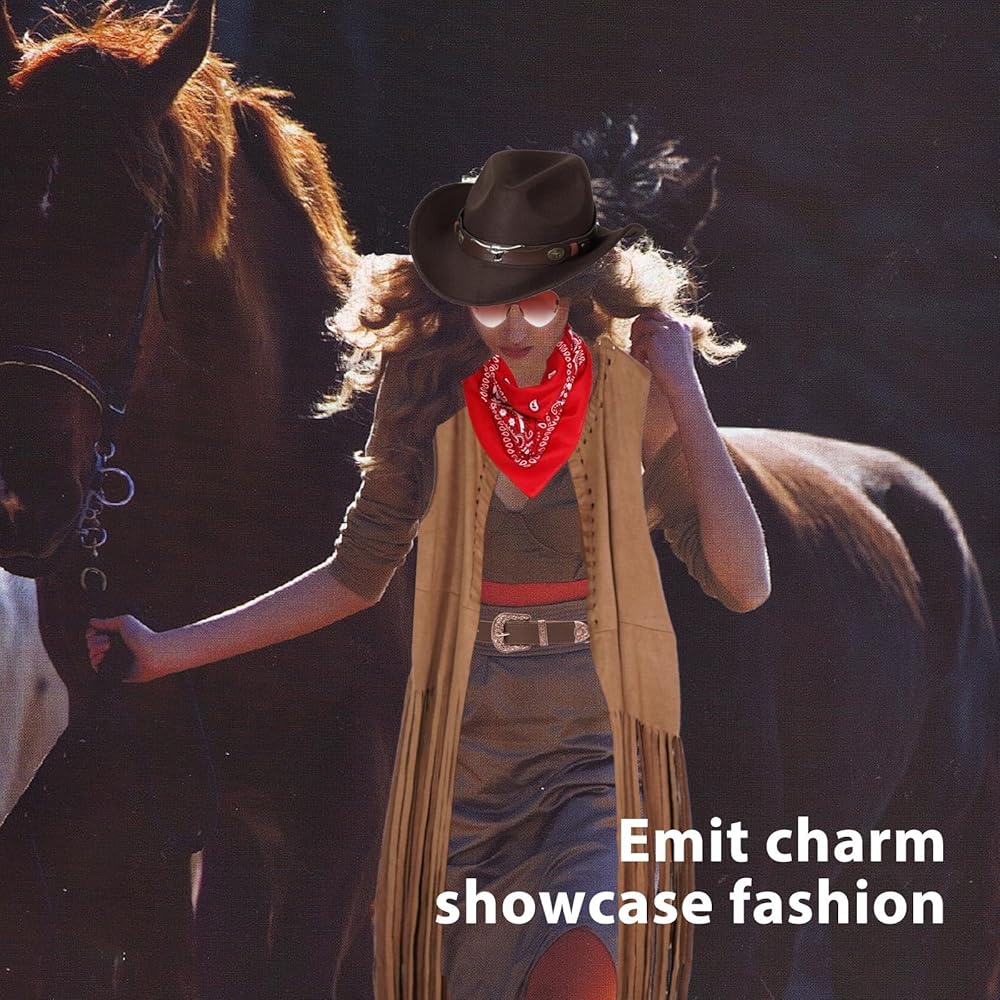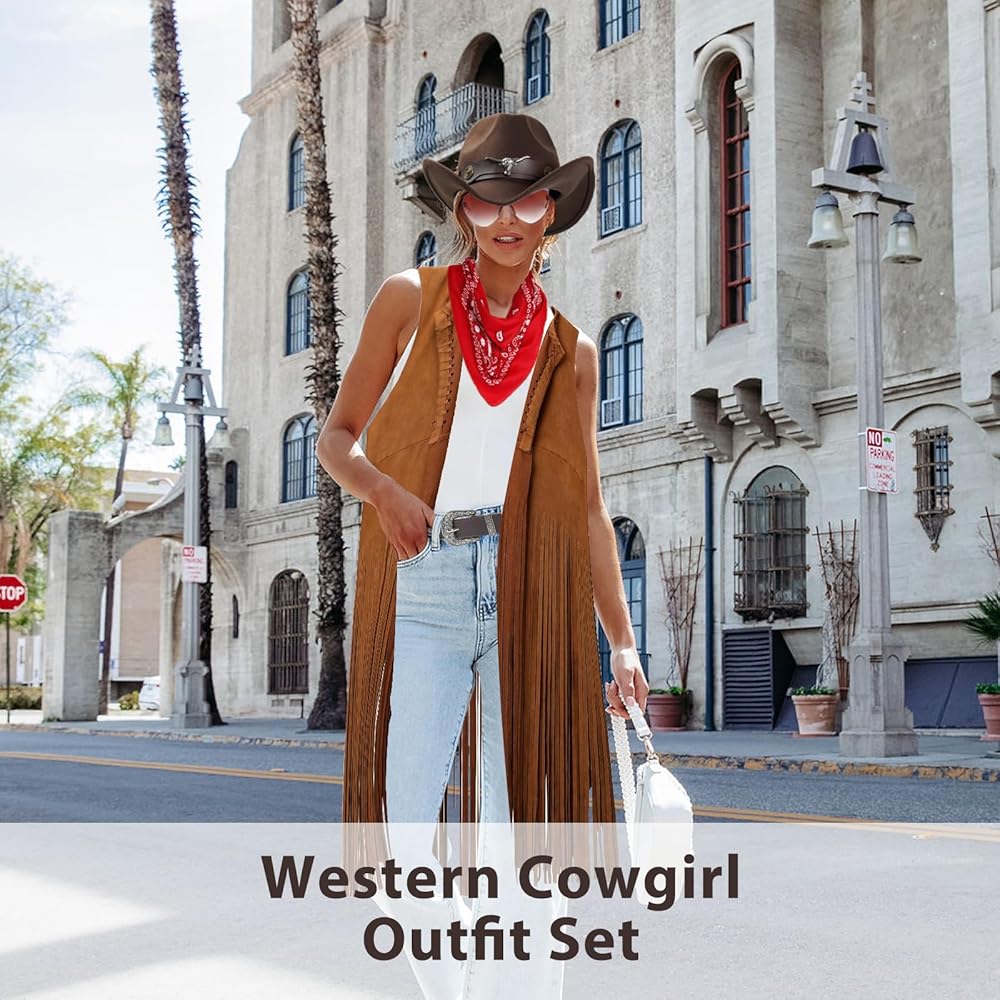 This complete cowgirl ensemble features a stylish long tassel vest, an iconic western cowboy hat, a women's cowgirl belt, a vibrant paisley bandana, and trendy sunglasses – everything you need for a standout look at Halloween parties and western-themed events.