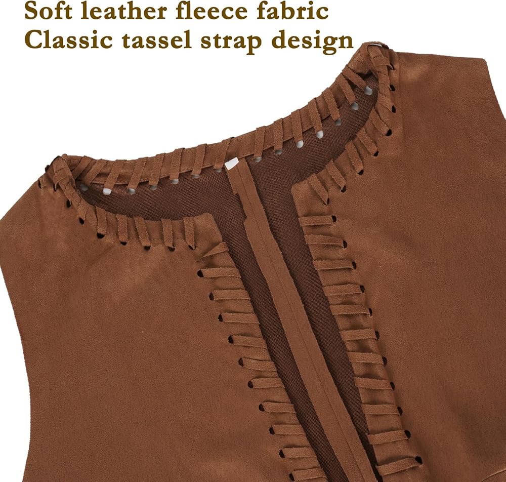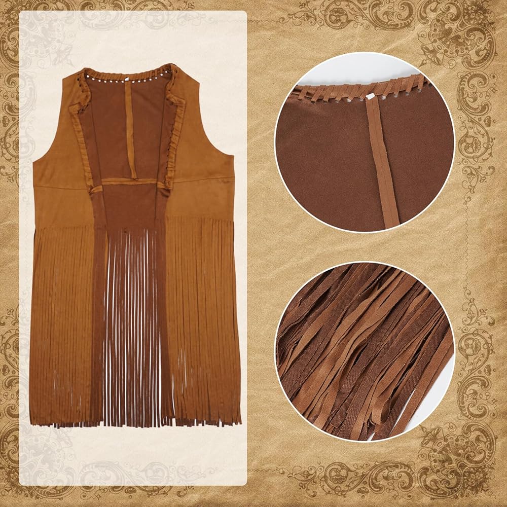Crafted with fine craftsmanship, our cowgirl vest is made of reliable faux suede, offering a luxurious feel while maintaining durability. The cowboy hat, crafted from luxurious cashmere, is soft to the touch and resistant to deformation or breakage. The bandana, constructed from quality polyester, ensures skin-friendly comfort for extended wear, while the sunglasses, made of premium plastic, ensuring long-lasting enjoyment without fading.