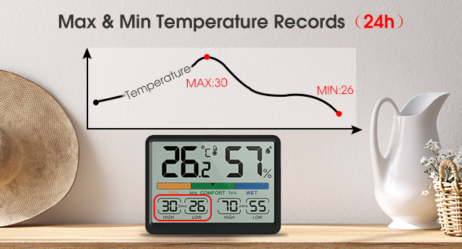 [مقياس حرارة داخلي دقيق للرطوبة] - سيُظهر مستوى درجة الحرارة والرطوبة الحالي، بالإضافة إلى الارتفاع والمنخفض خلال 24 ساعة السابقة.