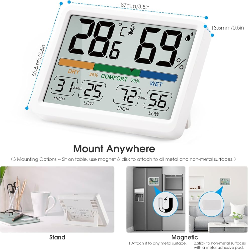 [3 خيارات للتركيب] - يمكن لجهاز مراقبة الرطوبة هذا الوقوف على الطاولة باستخدام المسند. هناك دعامة مغناطيسية يمكن وضعها على الثلاجة وتأتي مع وسادة لاصقة معدنية، مما يسمح بتركيب الشاشة في أي مكان.