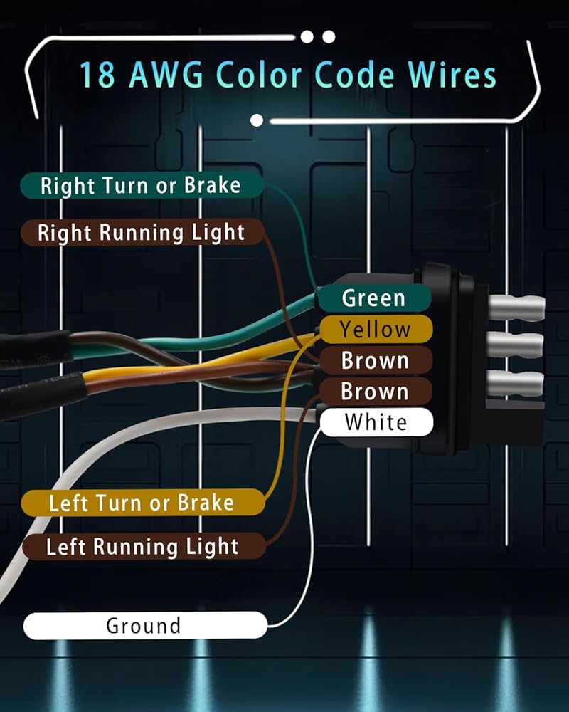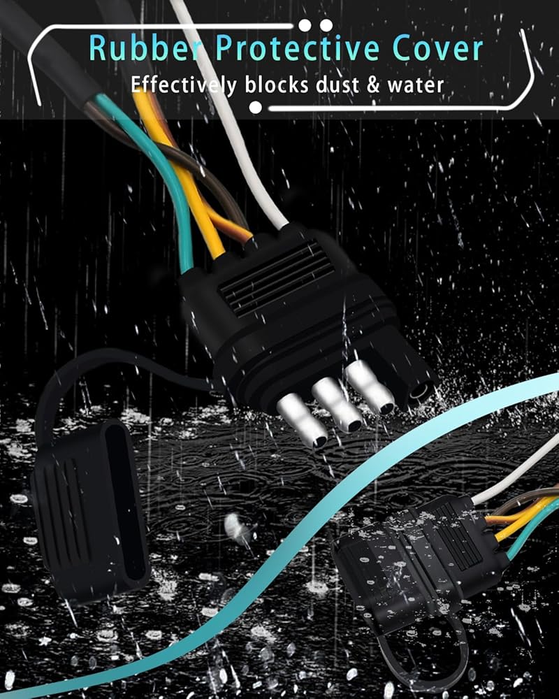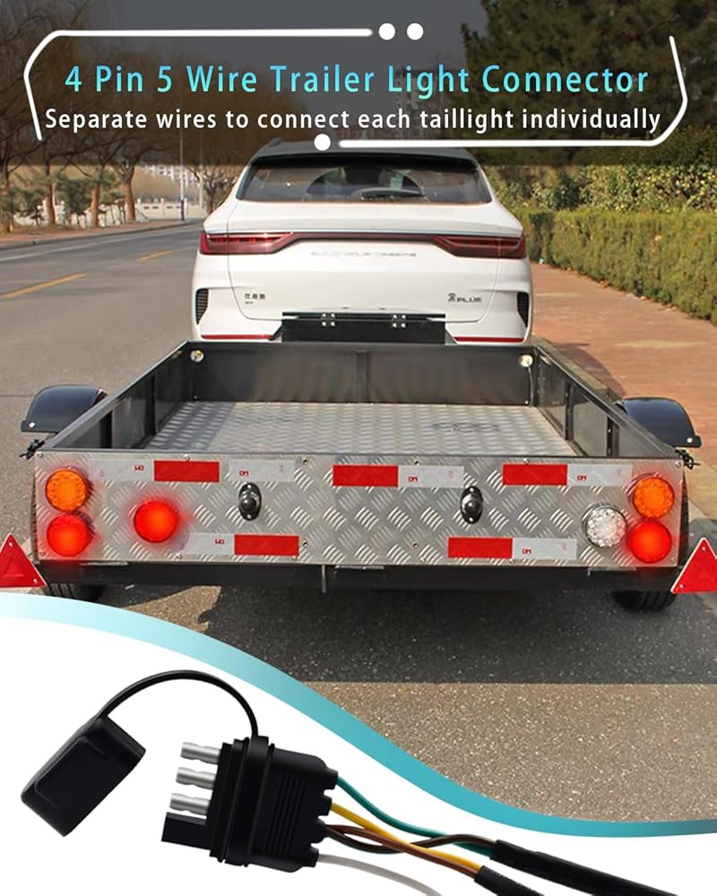 سلك مرمز بالألوان - موصل مسطح جانبي لسلك المقطورة بأربعة اتجاهات و5 أسلاك يأتي مع أسلاك مرمزة بالألوان، سهل التعرف عليه وسهل التركيب، ويمكن توصيله بسهولة بأسلاك المقطورة الموجودة لتوصيل مصابيح الفرامل وإشارات الانعطاف واليسار واليسار المصابيح الخلفية اليمنى في الجزء الخلفي من المقطورة.
