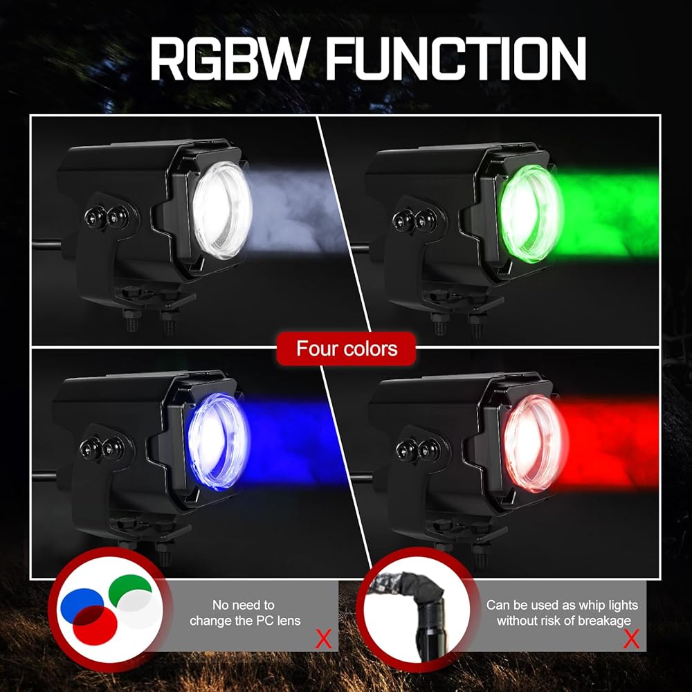 أحدث مصابيح سوط الليزر المصممة مع وظيفة RGBW، 4 ألوان (الأحمر والأخضر والأزرق والأبيض) تنطبق على سيناريوهات مختلفة، الألوان التي يمكن التحكم فيها فقط عن طريق مفتاح الروك أو جهاز التحكم عن بعد اللاسلكي لا تحتاج إلى تغيير عدسة الكمبيوتر، ويمكن التحكم بها من الداخل السيارة عن طريق المفتاح المتأرجح أو خارج السيارة عن طريق جهاز التحكم عن بعد اللاسلكي في نطاق 15 مترًا؛ يمكن استخدامه كضوء إشارة، ومصباح تحذير، وأضواء سوط، دون التعرض لخطر الكسر مقارنة بمصابيح السوط القديمة.