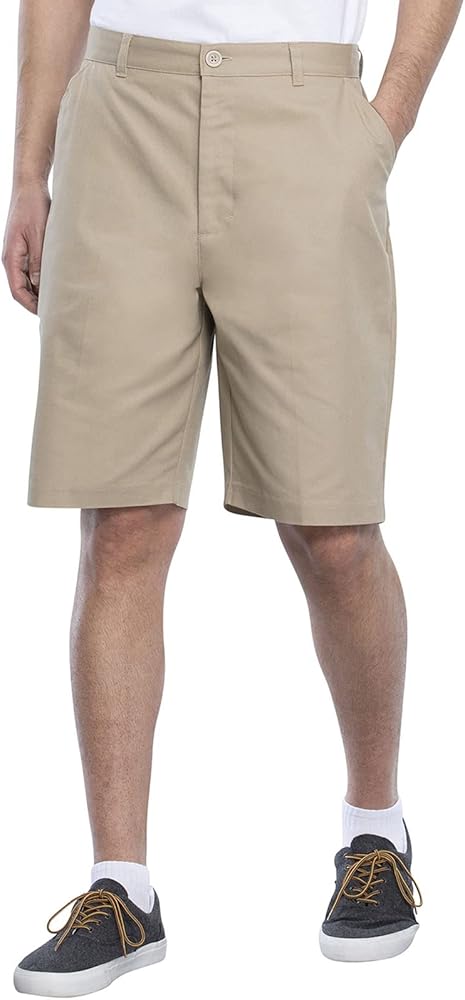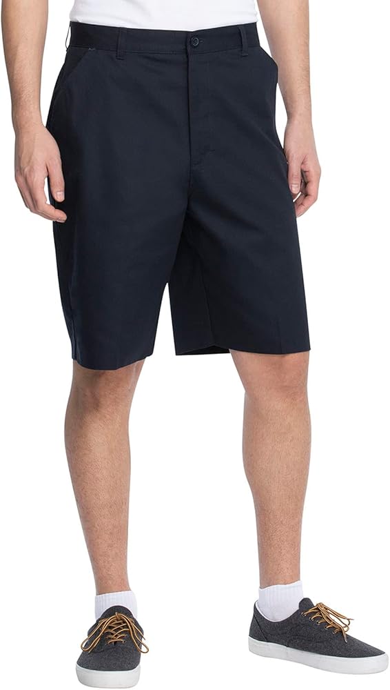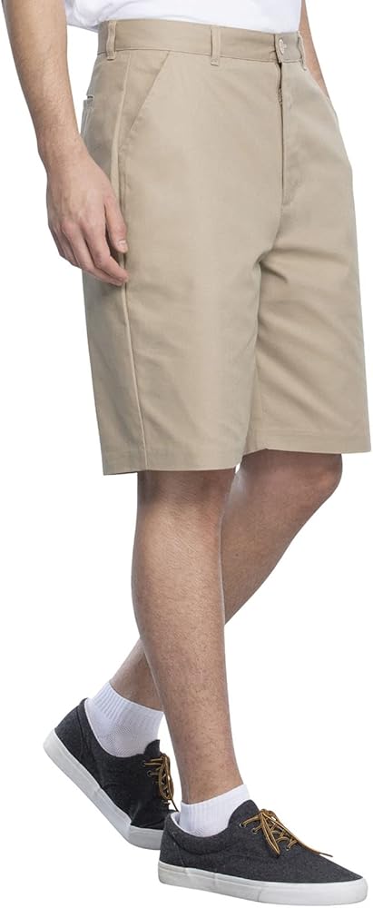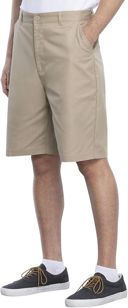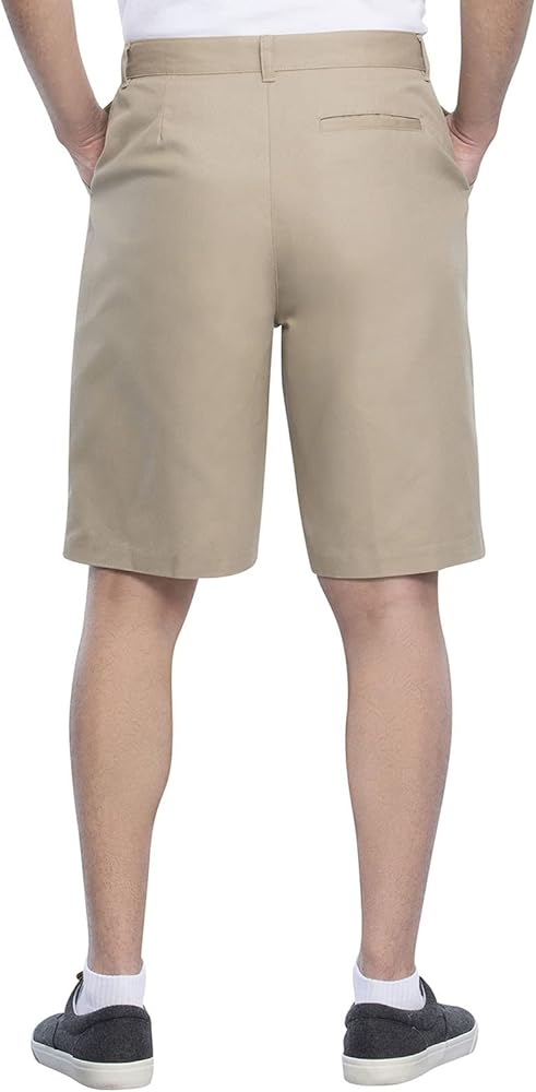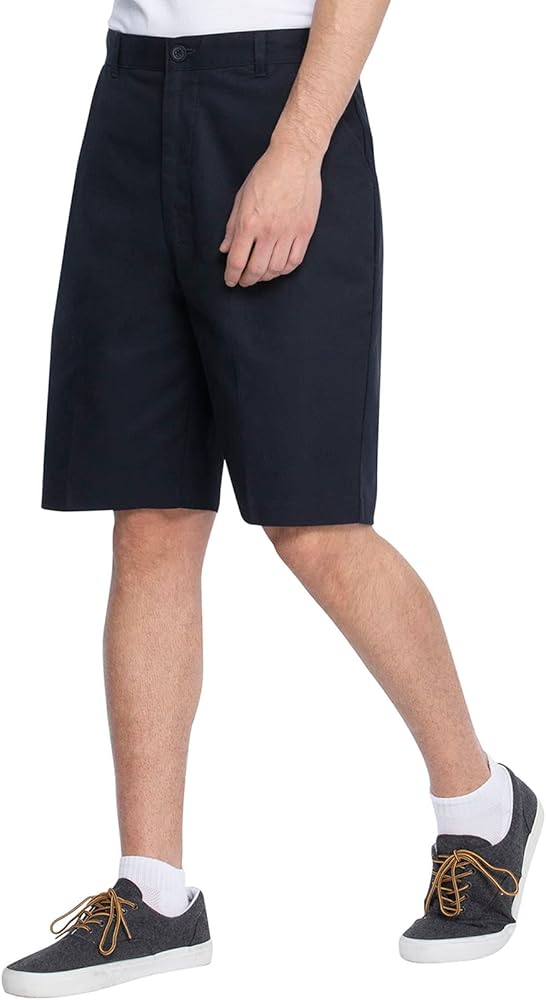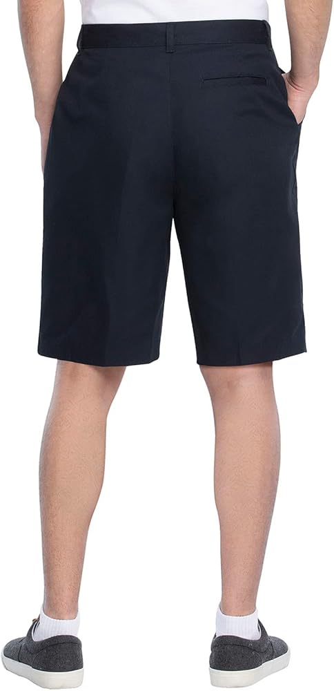 Real school collection by classroom boys flat front adjustable waist short. Button front closure with 2 front pockets and a back welt pocket. Easy care 60 percent cotton/40 percent polyester twill