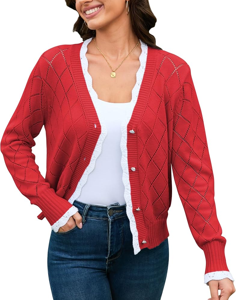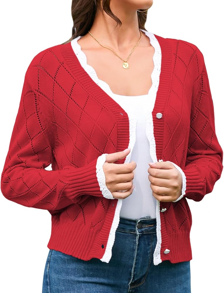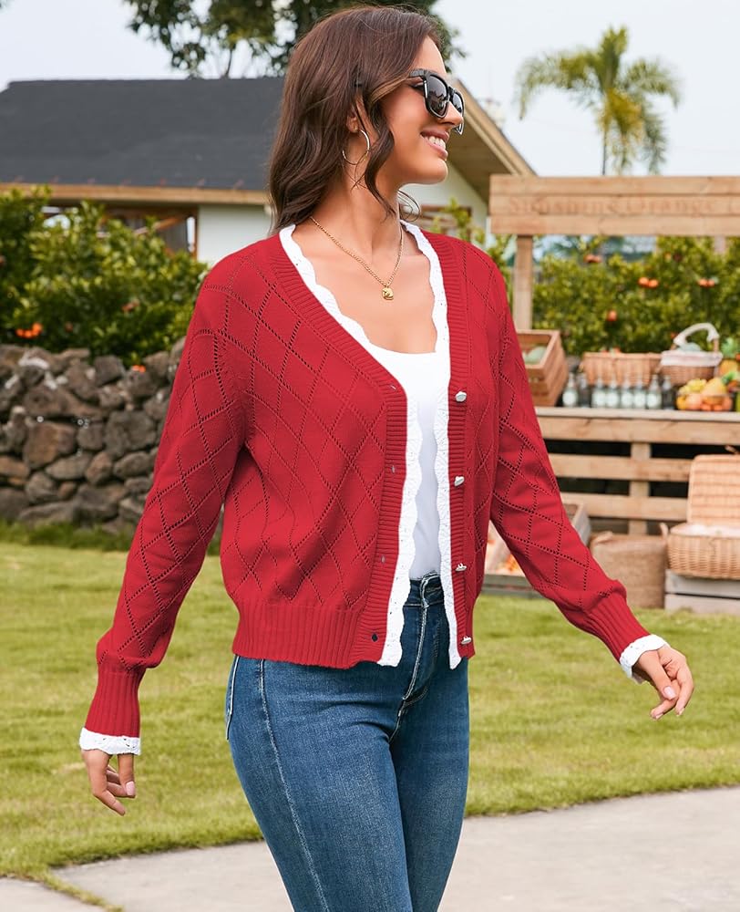 نمط كارديجان كروشيه: يمكن ارتداء السترة القصيرة مع سترة مريحة بدون أكمام ومعطف في الخريف والشتاء للحصول على سترات دافئة بأزرار لؤلؤية للنساء والسيدات، مثالية للسراويل الطويلة أو التنورة أو السراويل القصيرة، للحصول على مظهر كاجوال أو عصري.