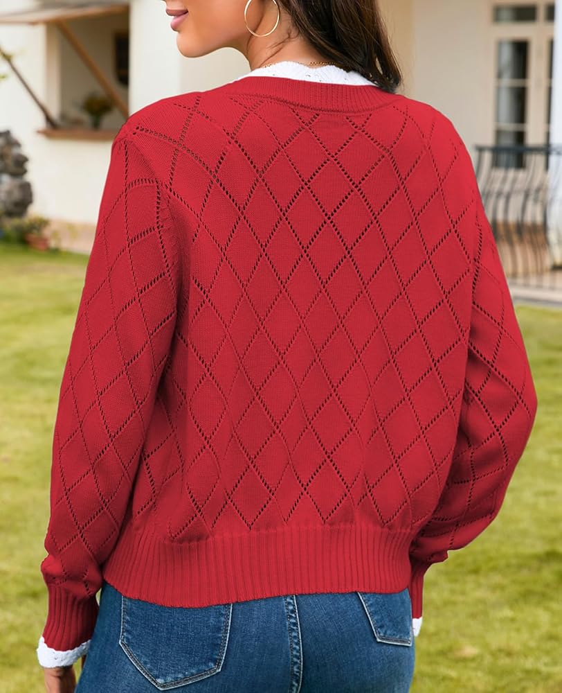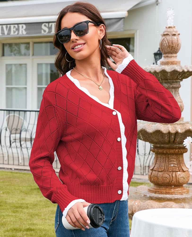 تصميم سترة ذات أكمام صدفية: سترة صوفية مقصوصة، سترة رقبة على شكل حرف V، سترات صوفية كروشيه، سترة طويلة الأكمام، سترة صوفية صدفية، سترة بأزرار لؤلؤية، سترة صوفية للنساء والسيدات في الربيع والخريف والشتاء