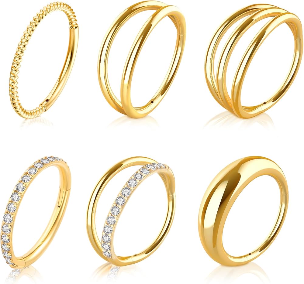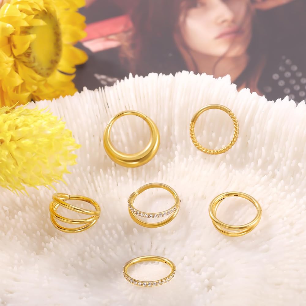 funtopia 18g حلقات الأنف الأطواق، 6 قطع 316l الجراحية الصلب هوب حلقات الأنف للنساء الرجال، الذهب تشيكوسلوفاكيا الفرس يتوقف حلقة الحاجز حلقة مزدوجة هوب، 8mm الشفاه دايث روك محارة هيئة ثقب المجوهرات