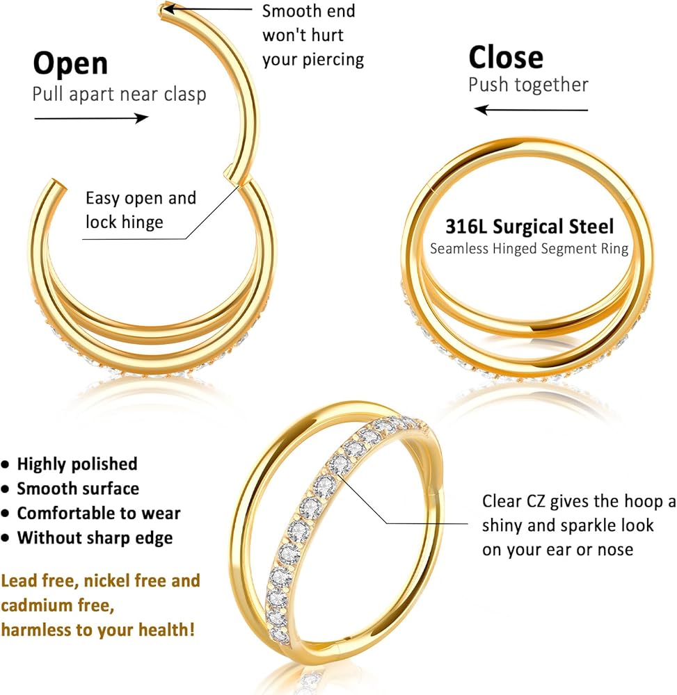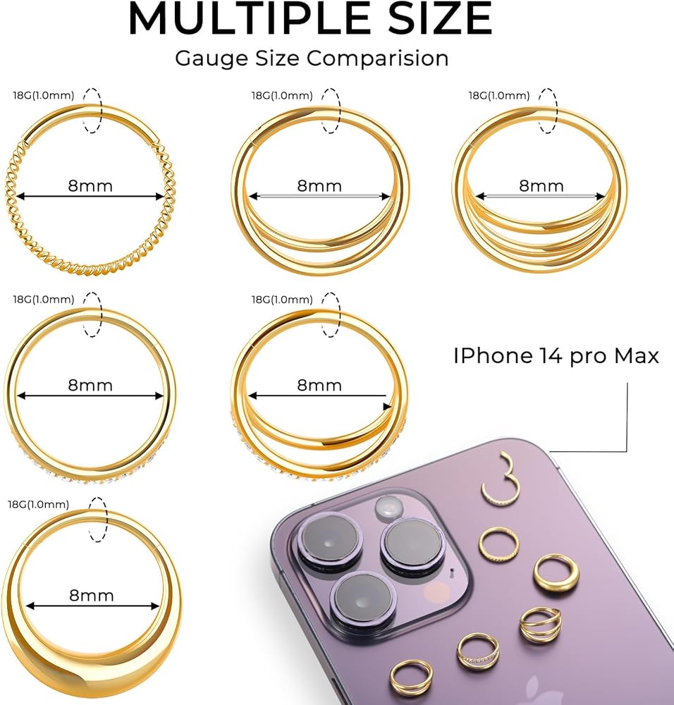 • حجم مريح وسهل الاستخدام: قياس 18 (سُمك 1.0 مم)، القطر الداخلي 8 مم، مما يوفر ملاءمة قياسية لثقب الأنف. يسمح تصميم الجزء المفصلي بسهولة الفتح والإغلاق، مما يضمن إغلاقًا سلسًا يظل آمنًا حتى بعد الاستخدام لفترة طويلة.