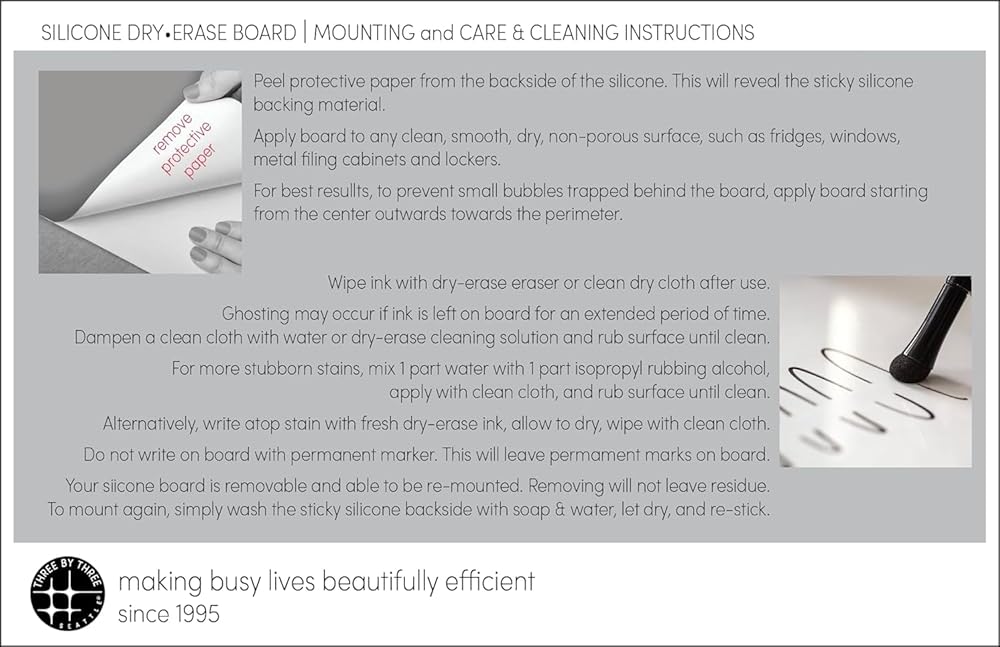 • Silky Smooth Silicone: Dry-erase surface on removable and washable silicone. Adheres naturally to smooth, clean, non-porous surfaces and can be repositioned with ease.