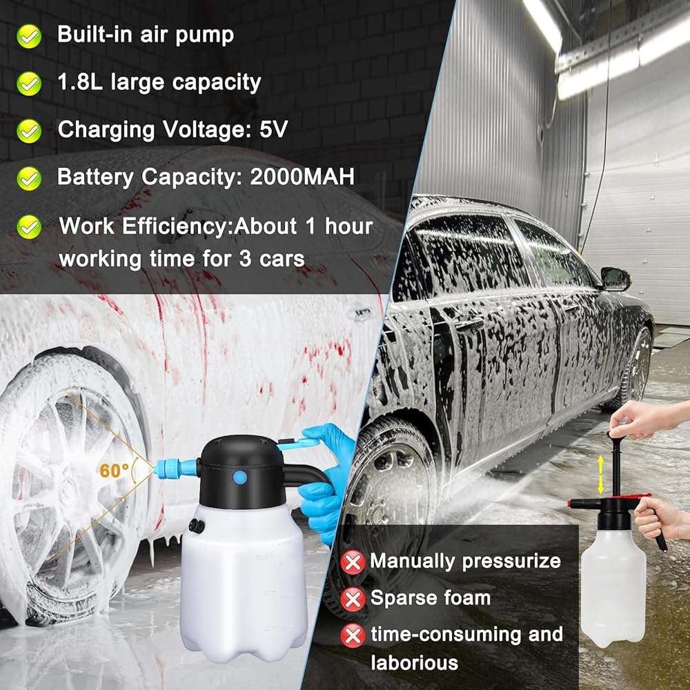 🔋【RECHARGEABLE USE WITH LONG ENDURANCE】 The charging port of the car foam sprayer is located on the side of the bottle at the handle. It takes three hours to fully charge. The battery foam sprayer is equipped with a 2000 mAh battery with a battery life of up to 1 hour, equivalent to 3200 presses of the old hand pump foam sprayer, which is enough for you to wash three cars, eliminating the need for frequent charging, saving time and energy