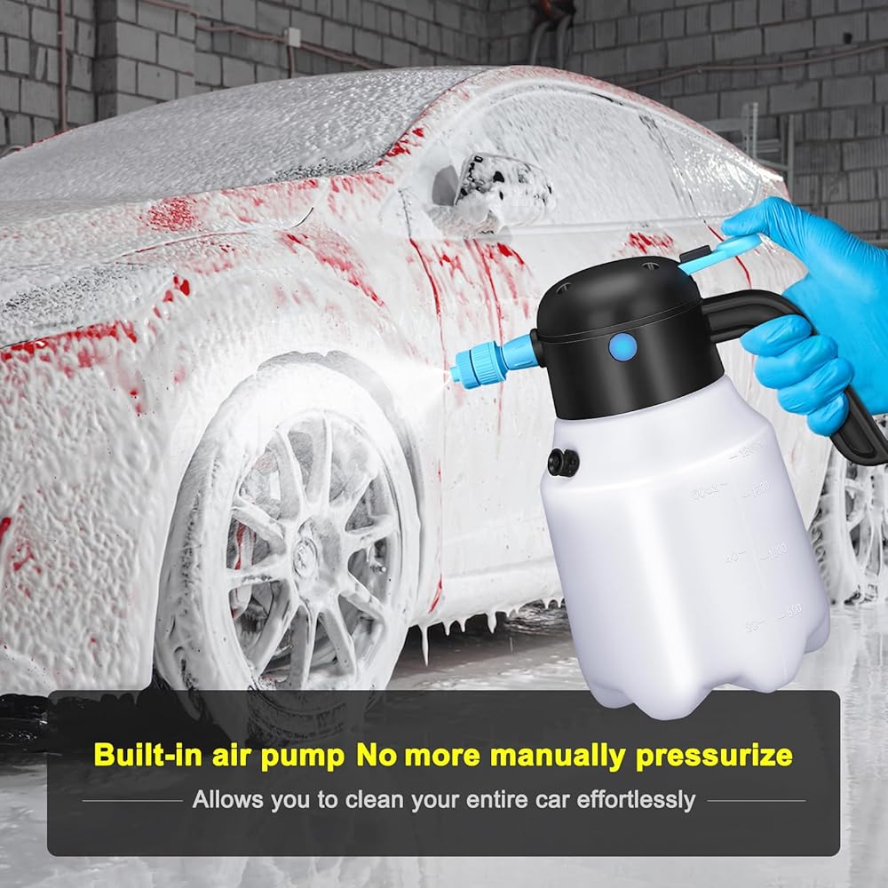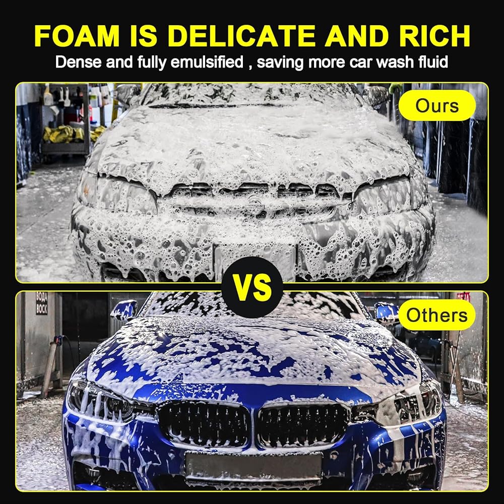 🙌【NEVER EVER HAVE TO STOP AND PUMP OVER AND OVER AGAIN】 Simply press the air inlet switch, the electric foam sprayer will automatically pressurize, then press the activation switch to use. Uniform and Rich Foam. Fully electric pressurized foam, no need to manually pressurize, no more worrying about low and uneven foam due to insufficient pressure during the car wash