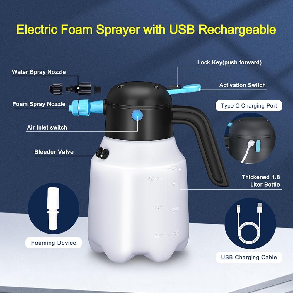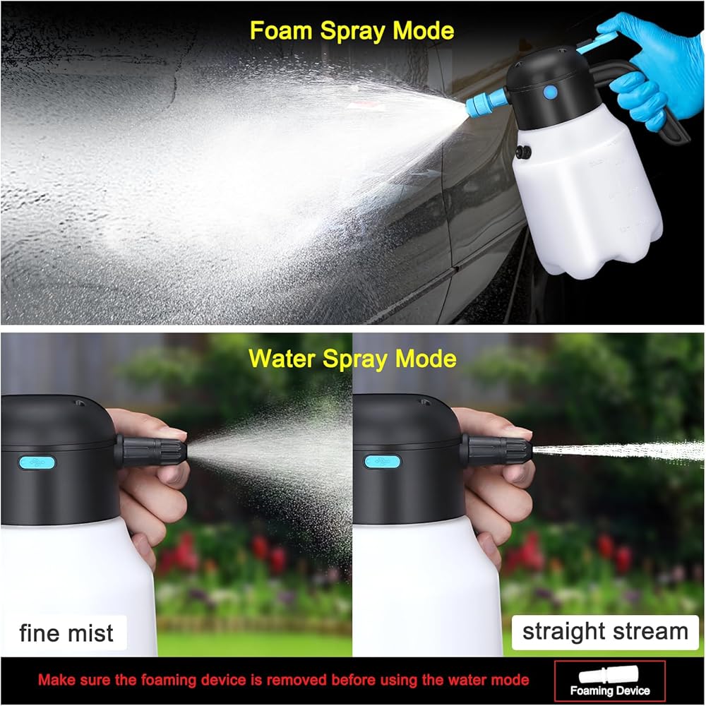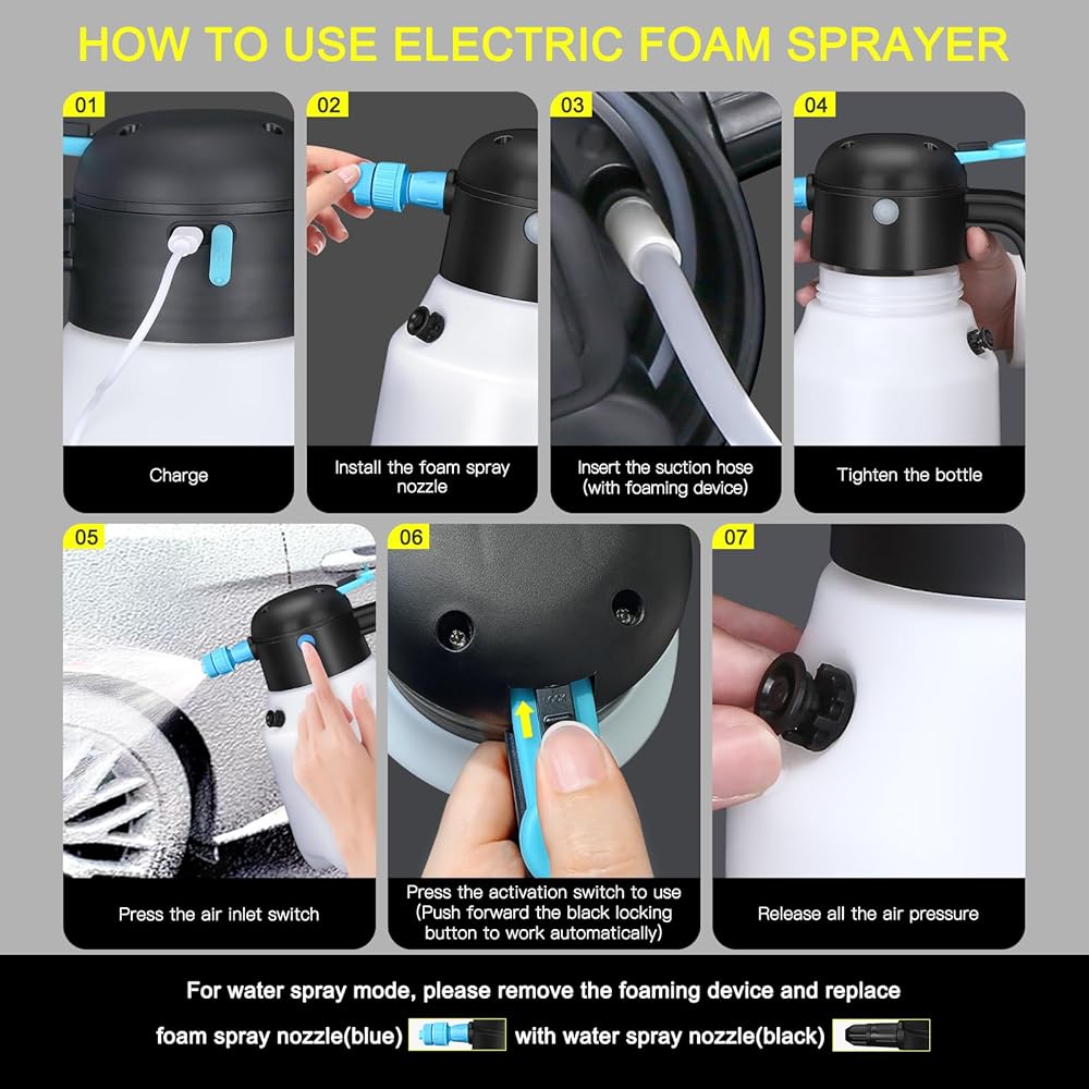 📑【READ INSTRUCTIONS ENCLOSED CAREFULLY FOR BETTER USE】 This electric car wash sprayer has a battery in the head, it is strictly prohibited to diffuse the sprayer head directly into the water. Please release all the air pressure inside the bottle through the bleeder valve after use and before unscrew foam sprayer head. Come with instructions, please read carefully before use. Any questions please feel free to contact us