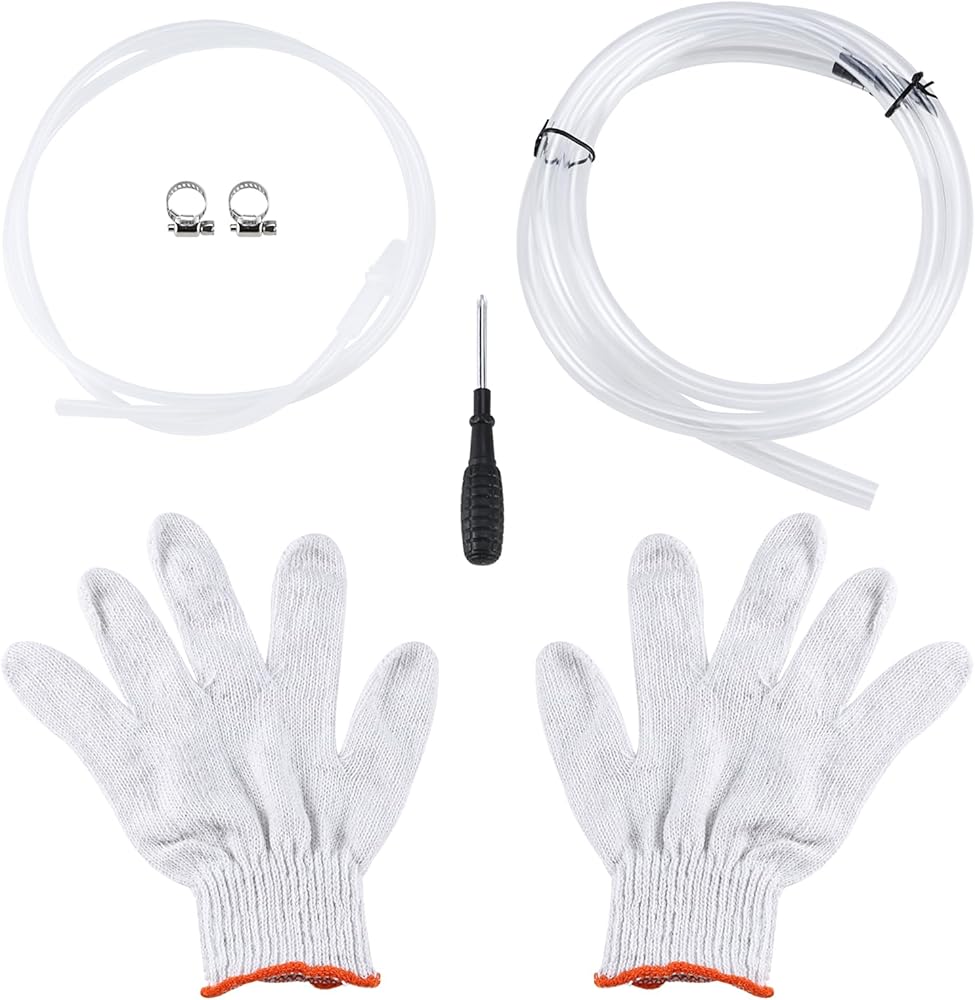 The oil transfer pump set contains an 8 x 7 x 4 inch, 1 pound oil change pump along with the following accessories: a 4.92ft outlet hose, a 3.93ft inlet hose, 2 hose locks, 2 battery clamps, gloves and screwdriver.