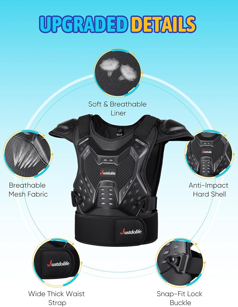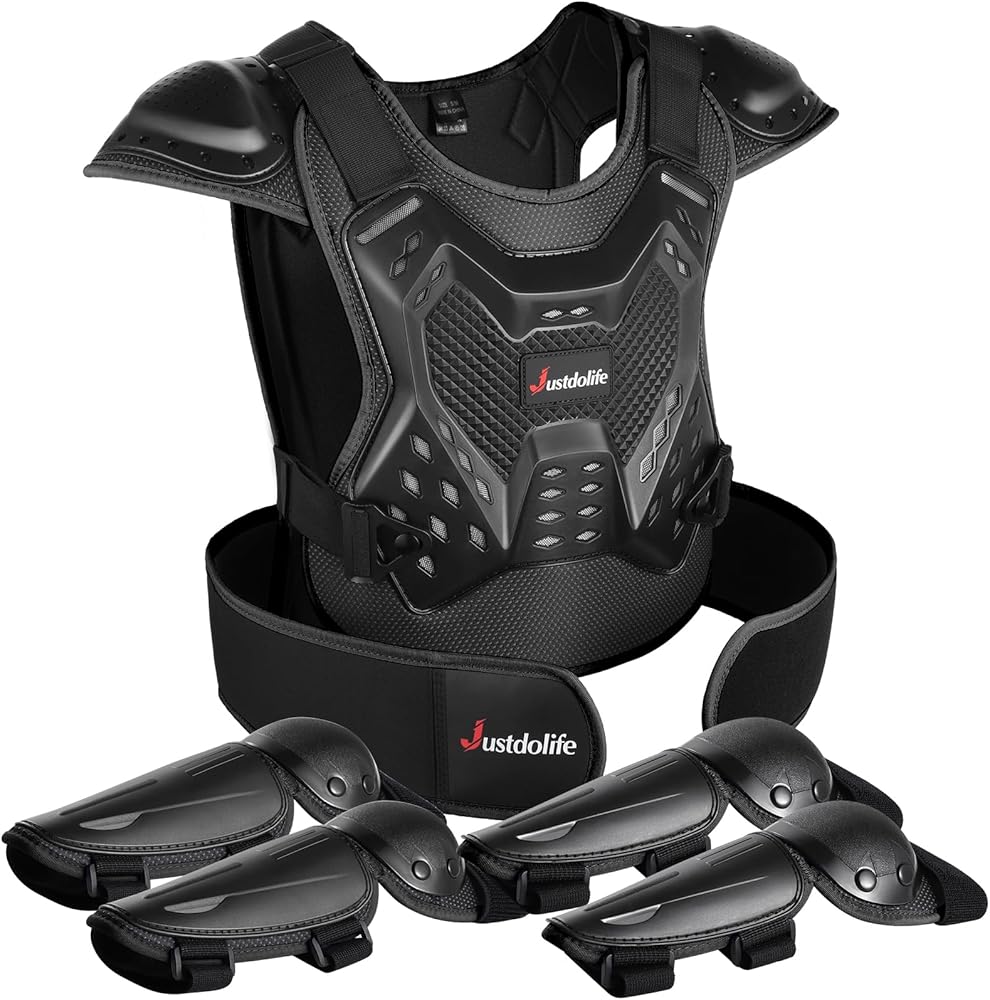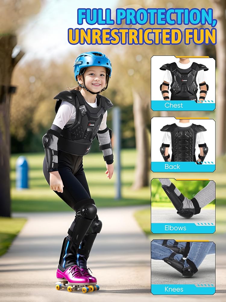 • Provide Full Protection & Fearless Fun: Our armor suit, complete with chest armor, elbow pads, and knee pads, offers all-around protection against falls, empowering your child to enjoy sports fun while giving you peace of mind. Equip your little one with confidence and courage to explore the outdoors fearlessly