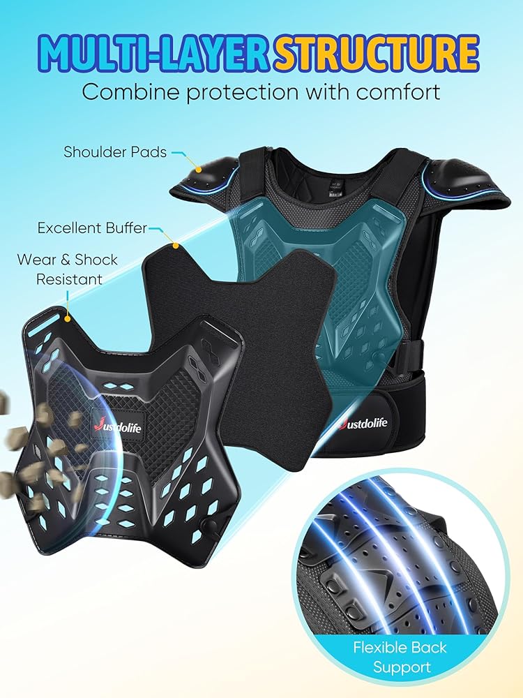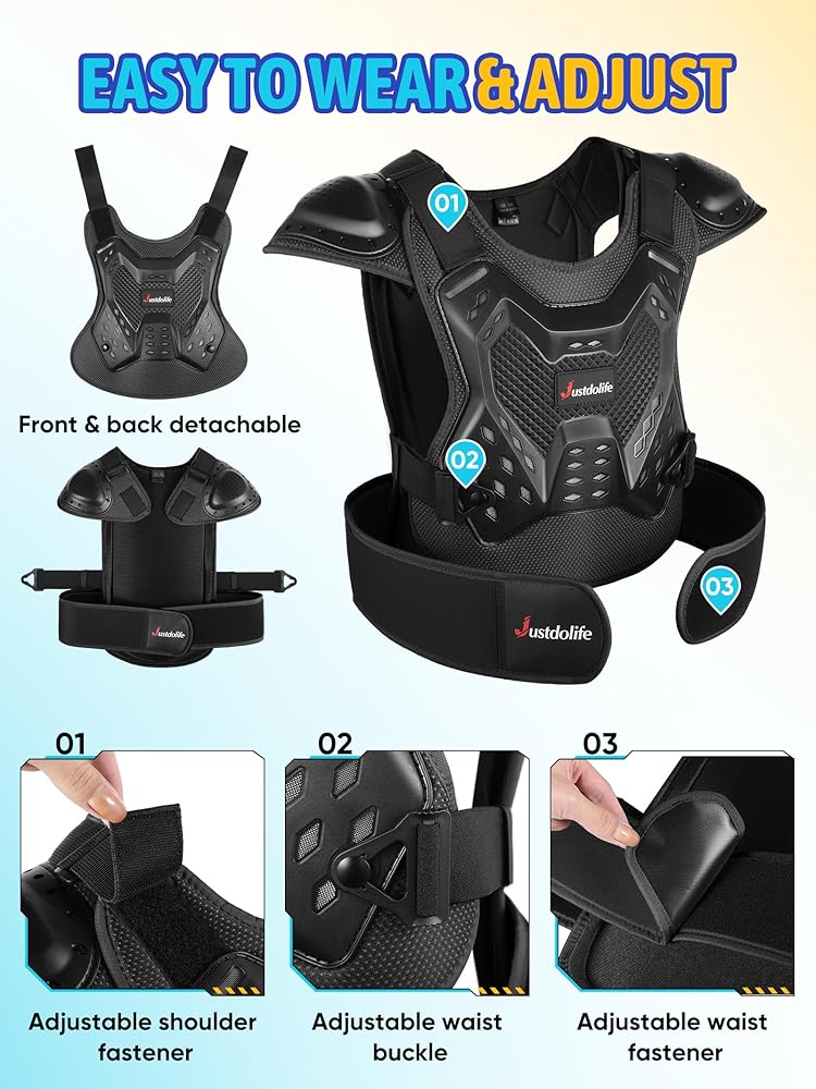 • Effortless Wear with Flexible Design: The 2-piece armor design allows for easy wearing and taking off, eliminating the hassle of stuck zippers or broken closures. The flexible, bendable back PE shells ensure unrestricted movement, allowing kids to move freely and comfortably during their activities