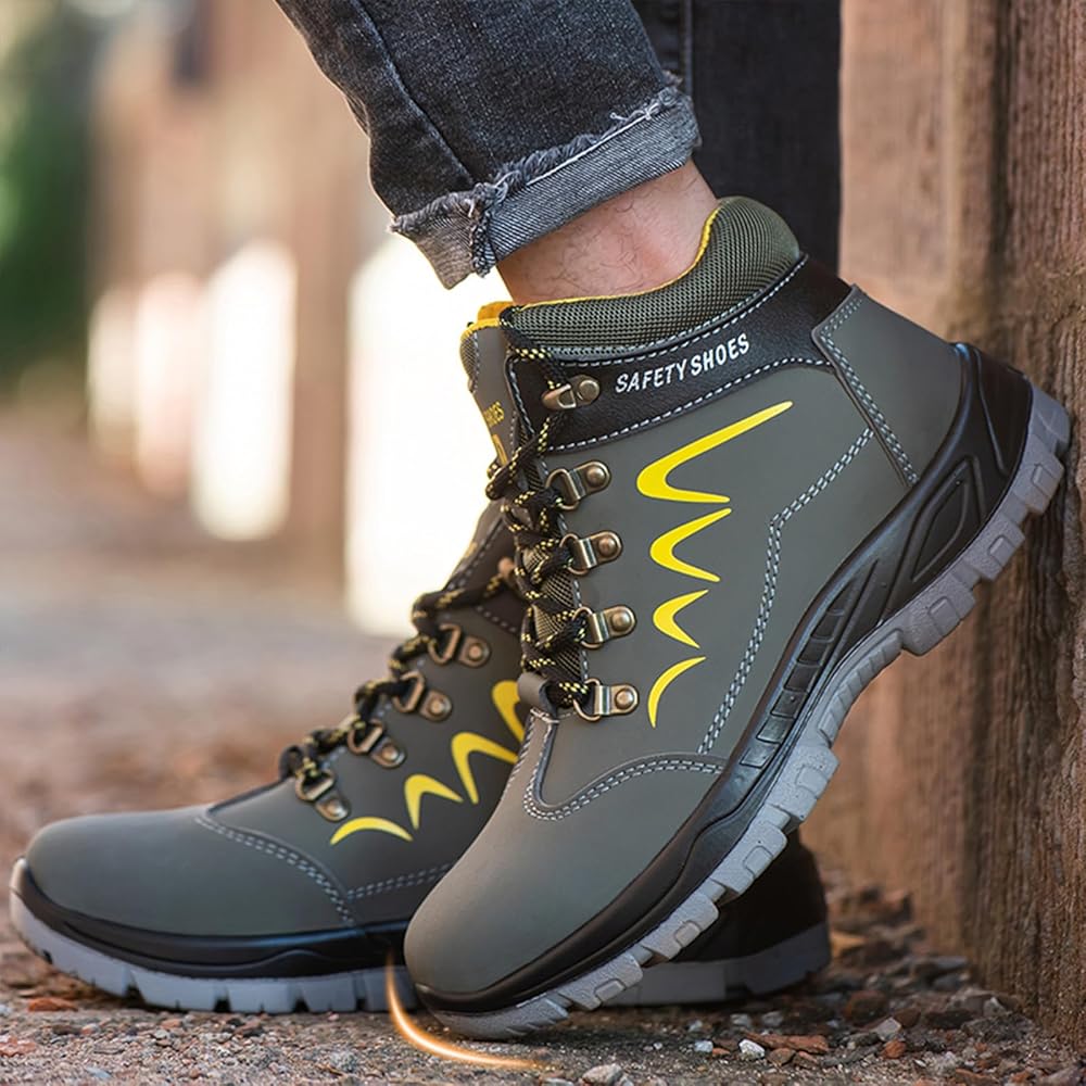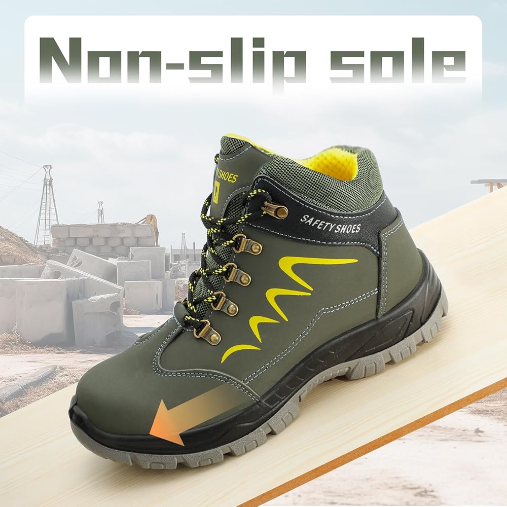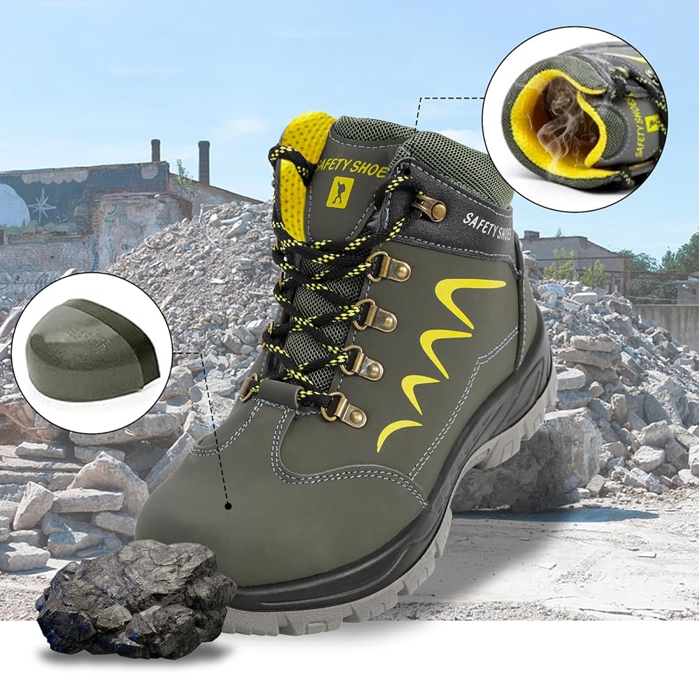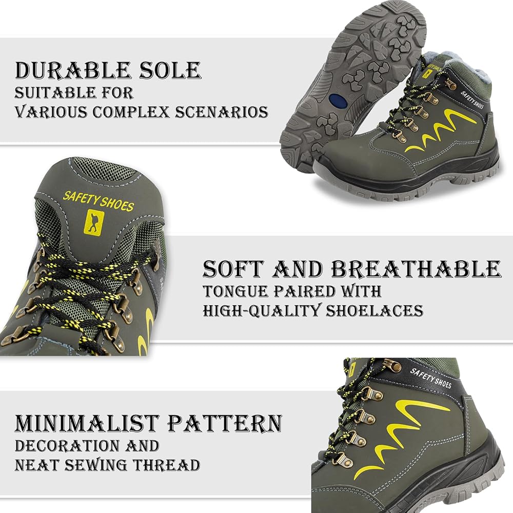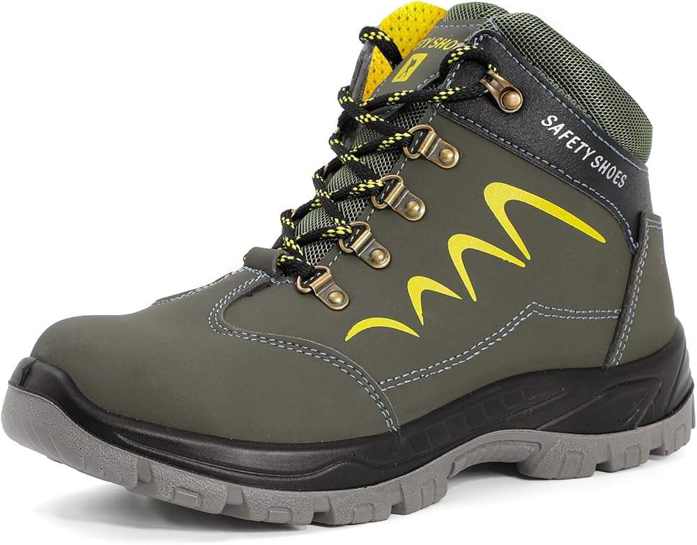 - النعل مصنوع من المطاط، وهو مقاوم للانزلاق والتآكل، مما يجعله مثاليًا للأشخاص الذين يعملون في المستودعات والبناء والتصنيع